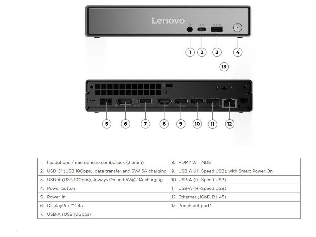 | Predné porty | 1x USB-C (USB 10Gbps / USB 3.2 Gen 2), with data transfer and 5V@3A charging 1x USB-A (USB 10Gbps / USB 3.2 Gen 2), with Always On and 5V@2.1A charging 1x headphone / microphone combo jack (3.5mm) |