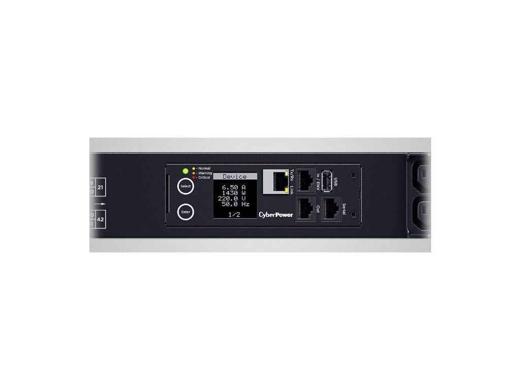 CyberPower PDU31406 Rozvodná jednotka (PDU) distribuuje napájanie pre viac zariadení prostredníctvom štandardných zásuviek, ktoré je možné použiť s bezpečnostnými a sledovacími systémami, telekomunikačnými zariadeniami, sieťovými zariadeniami, NAS / pamäťovými zariadeniami, satelitnými zariadeniami, multimediálnymi zariadeniami a pracovnými stanicami. Multifunkčný displej LCD dokáže zobrazovať presné podmienky napájania a používatelia môžu meniť jeho farbu, aby ľahko odlíšili zariadenia. Okrem toho je displej LCD výmenný za prevádzky kvôli ľahkej údržbe a má automatickú orientáciu LCD displeja pre jednoduché sledovanie.