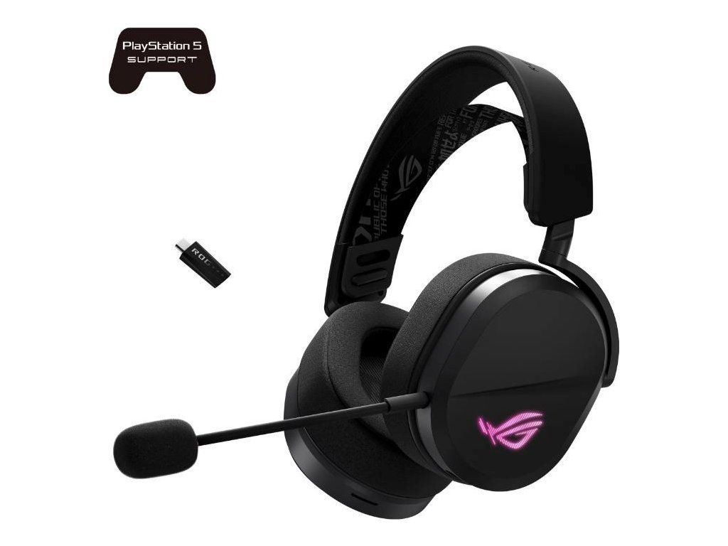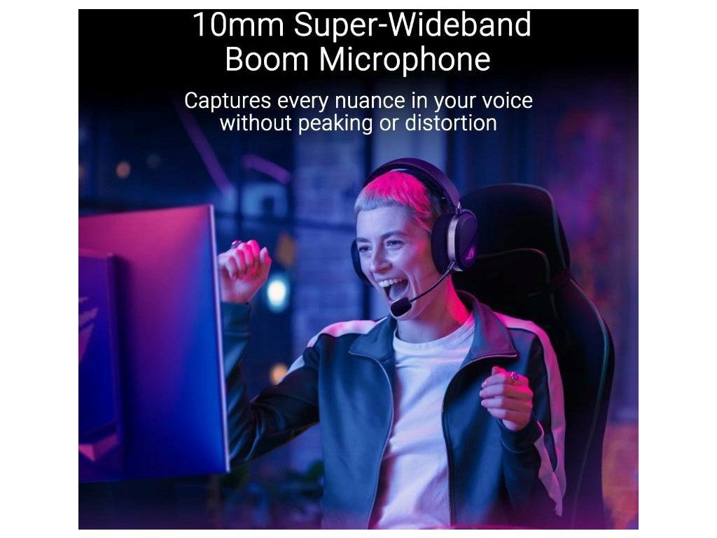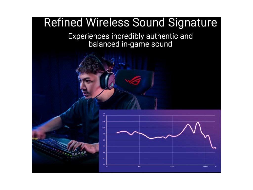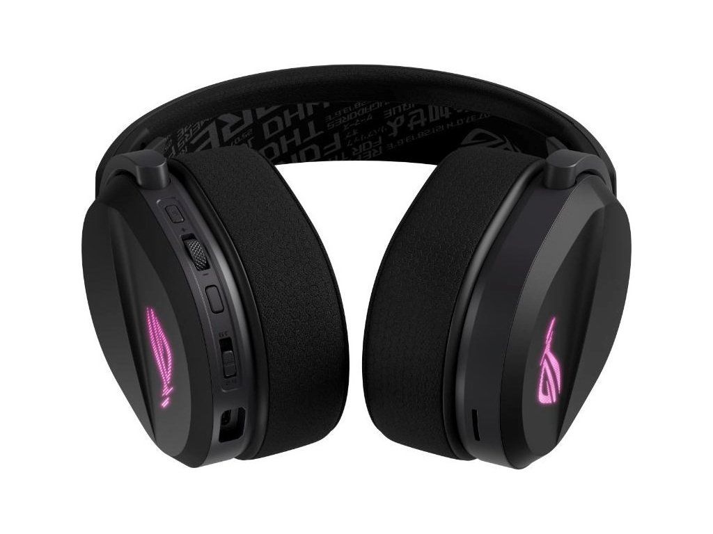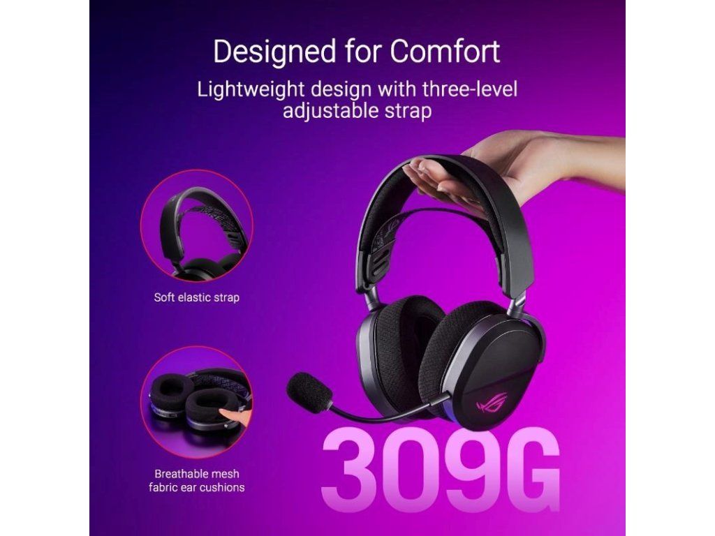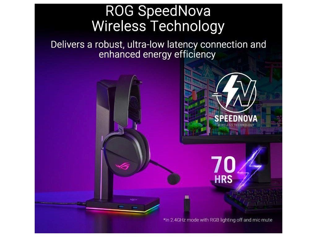 Herné slúchadlá so tri režimami RGB s bezdrôtovou technológiou ROG SpeedNova, 50mm ROG titanom pokovené membránové meniče, vylepšený bezdrôtový zvukový podpis, 10mm super širokopásmový raménkový mikrofón, ľahký dizajn 309 g a navyše osvetlenie ASUS Aura Sync RGB
