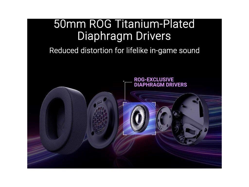 - 50mm meniče ROG s titanovou membránou: Exkluzívne meniče ROG zabezpečujú bohatý, detailný zvuk so širokým frekvenčným rozsahom 20 Hz–20 kHz