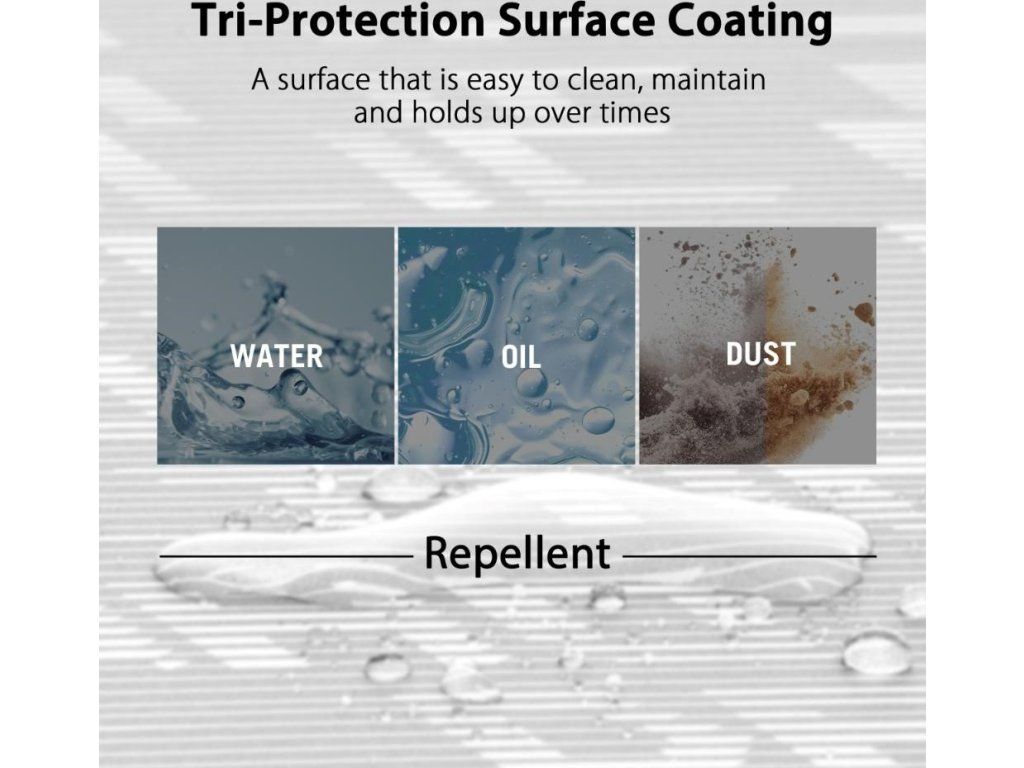 - Trojitá ochranná vrstva: Poskytuje povrch odpudzujúci vodu, olej a prach, ktorý sa ľahko čistí a udržiava