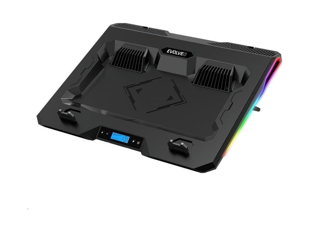 Chladiaca podložka EVOLVEO Ania 10 RGB s RGB podsvietením využijete pre notebooky o veľkosti 10-17". Bezbábežne oceníte možnosti nastavenia polohy a reguláciu otáčok ventilátora. Pomocou tlačidiel pri displeji je možné prepínať medzi tromi farebnými režimami (modrá, zelená a červená) a štyrmi RGB režimami, ktoré osvetľujú okraj podložky.