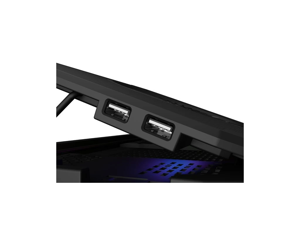 - Ergonomická vysoce výkonná chladicí podložka pro notebooky s úhlopříčkou až 17,3" vybavená skládacími nožkami, které umožňují nastavit výšku podložky a současně zvyšují komfort používání.