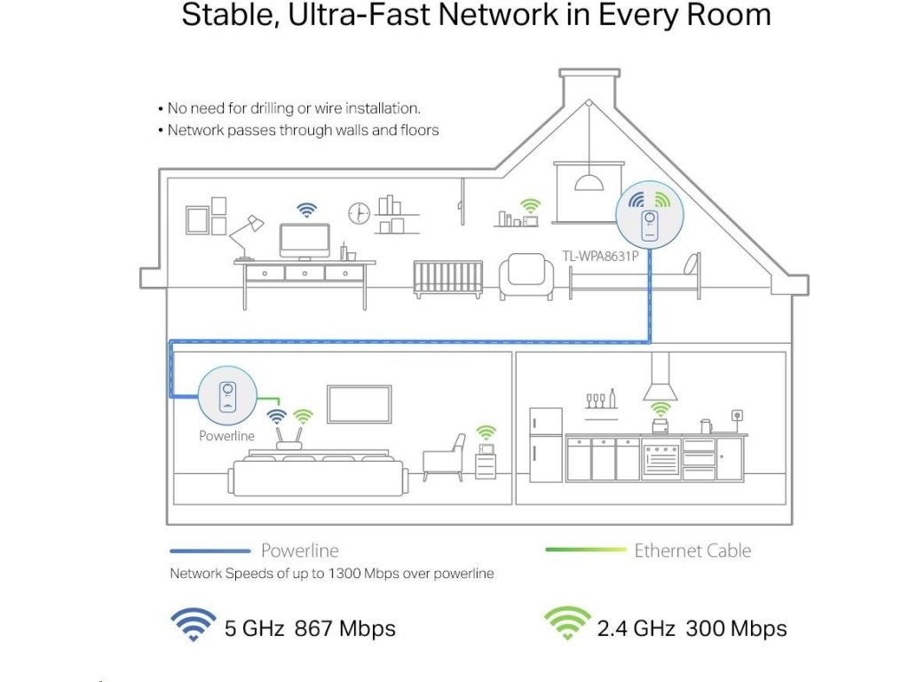 - Dvoupásmová sieť Wi-Fi AC1200 – zariadenie rozšíri ultra rýchlu dvoupásmovú Wi-Fi sieť s rýchlosťou až 867 Mbit/s v pásme 5 GHz a až 300 Mbit/s v pásme 2,4 GHz.