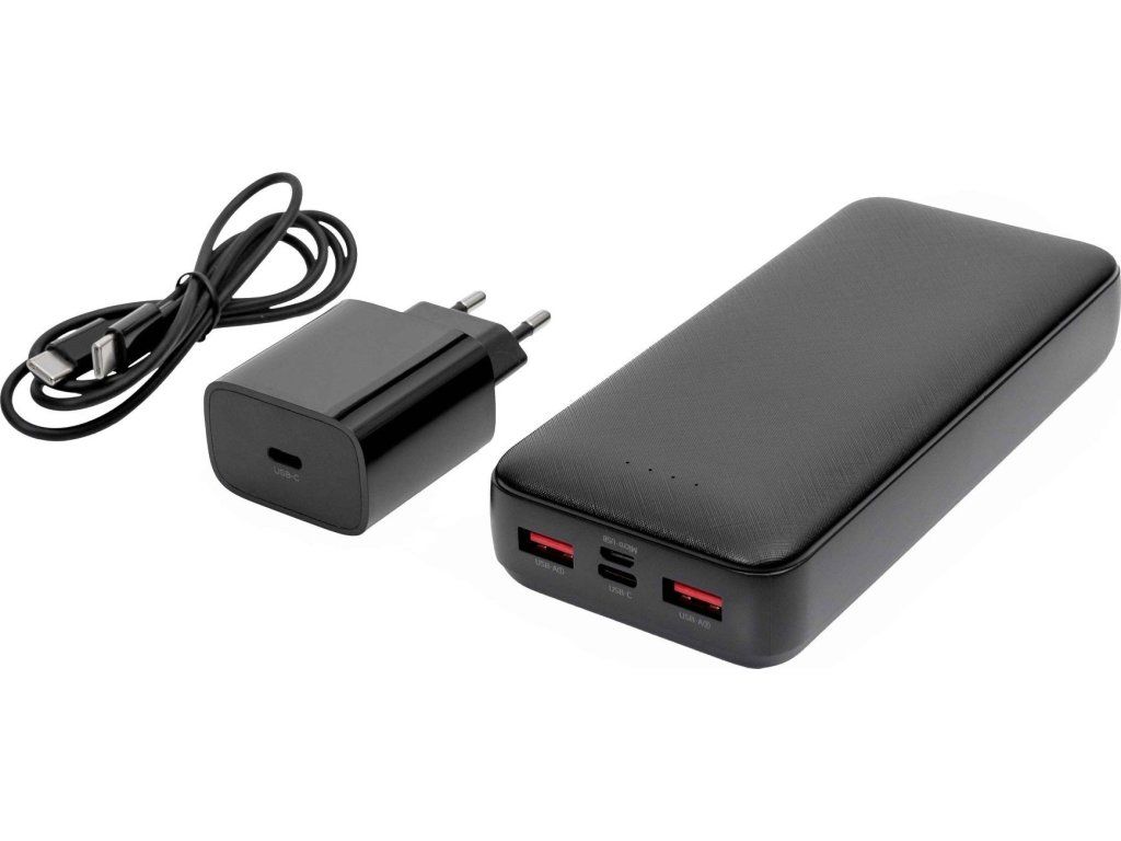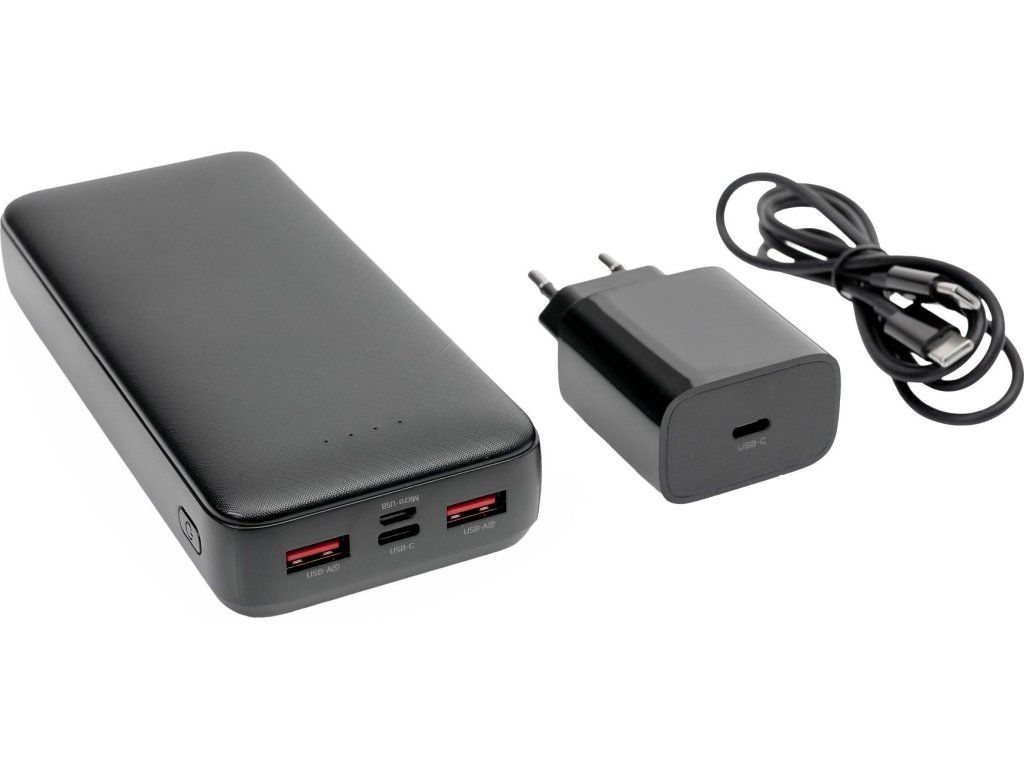 Set 3v1, s ktorým udržíte vaše mobilné zariadenie vždy plné energie a nebudete sa na cestách musieť ďalej stresovať rýchlo sa znižujúcim stavom batérie. Set PMPB20SETB obsahuje: Powerbanku o kapacite 20000mAh s tromi portami: 1xUSB-C; 2xUSB-A, ktorý zaistí výkon až 20W pri nabíjaní s technológiou PD (Power Delivery). Sieťová nabíjačka s výkonom 20W s technológiou PD a USB-C konektorom (Power Delivery 3.0). Kábel USB-C / USB-C s dĺžkou 100 cm, zaisťujúci stabilný maximálny výkon s oboch nabíjacích zariadení. Hlavné vlastnosti: Kapacita: 20 000 mAh / 3,7 V 20W PD nabíjačka: Technológia Power Delivery 3.0 Dĺžka kábla: 100 cm (USB-C na USB-C) Výstupné porty: 2x USB-A, 1x USB-C Rýchle nabíjanie: Áno (PD 3.0) Farba: Čierna Technické špecifikácie: Vstup: USB-C: 5 V/2 A, 9 V/2 A, 12 V/1,5 A Výstup: 5V/3A, 9V/2,22A, 12V/1,67A (PD 3.0) Nabíjačka - Vstupné napätie: 100-240V AC, 50/60Hz Nabíjačka - Výstup: 5V/3A, 9V/2,22A, 12V/1,67A (PD 3.0) Rozmery a hmotnosť: Powerbanka: 160 x 68 x 29 mm, 150 g Rozmery a hmotnosť: Nabíjačka: 80 x 43 x 28 mm, 49 g