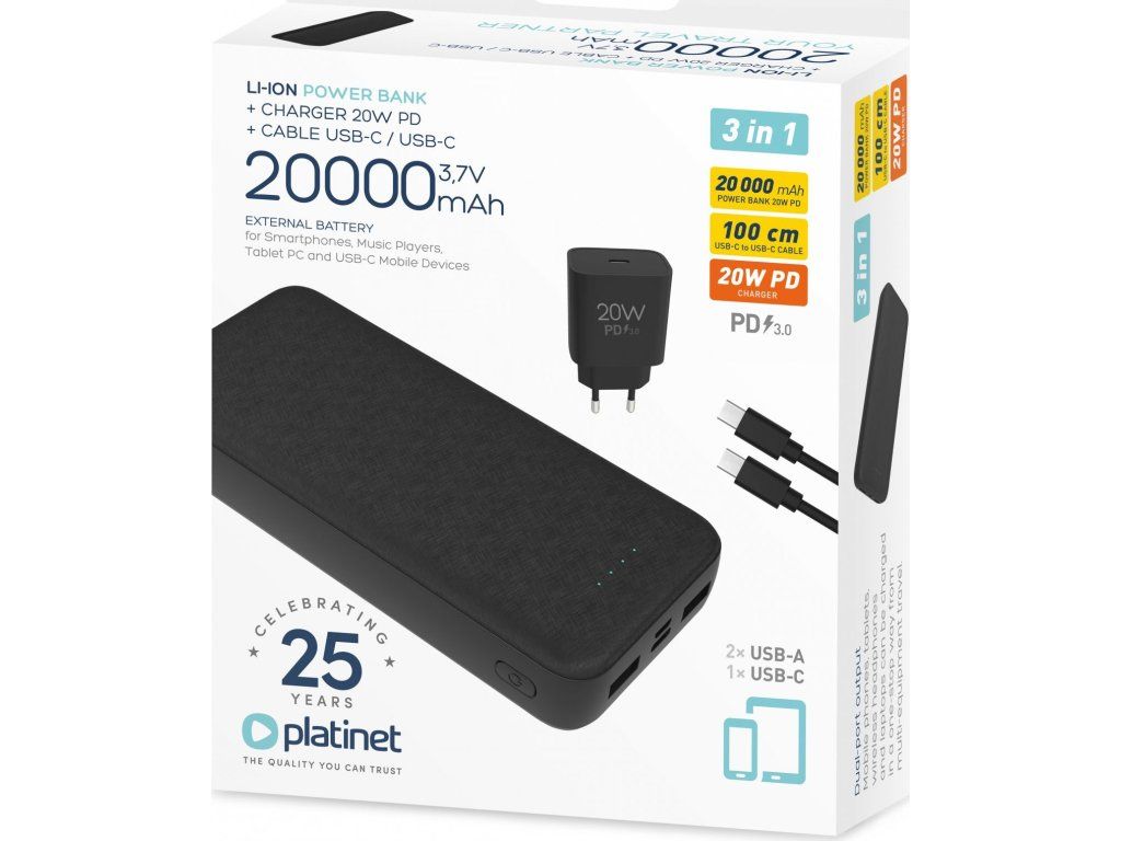 Platinet PMPB20SETB SET 3v1 Powerbanka 20000 mAh + Nabíjačka 20W Power Delivery, kábel USB-C 1m, black