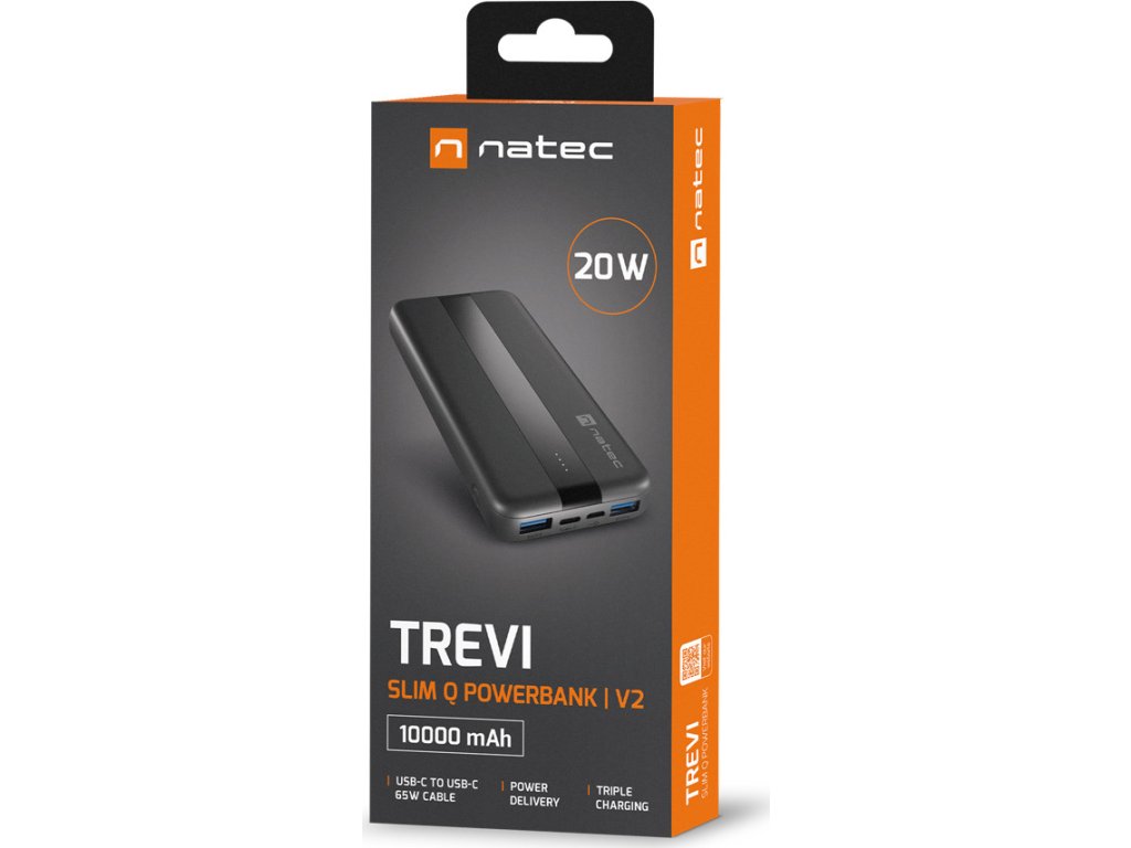 Powerbanka Natec Trevi Slim Q je všestranný a nepostradatelný nástroj pro nabíjení vašeho zařízení. Postará se o to její velká kapacita, porty podporující Power Delivery (20 W) a Quick Charge (18 W) a ultratenký design, takže ji můžete vzít téměř kamkoli s sebou.