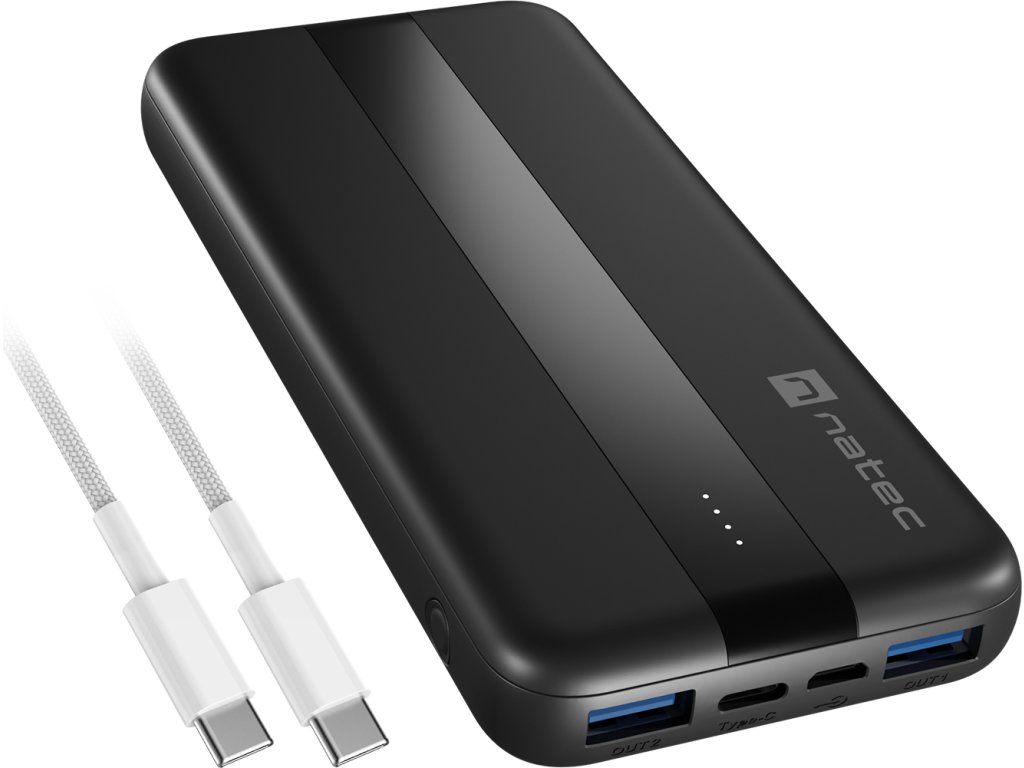 Power banka Natec TREVI SLIM Q V2 10000mAh, 2X USB-A 18W, 1X USB-C 20W, USB-C - USB0-C kabel, černá