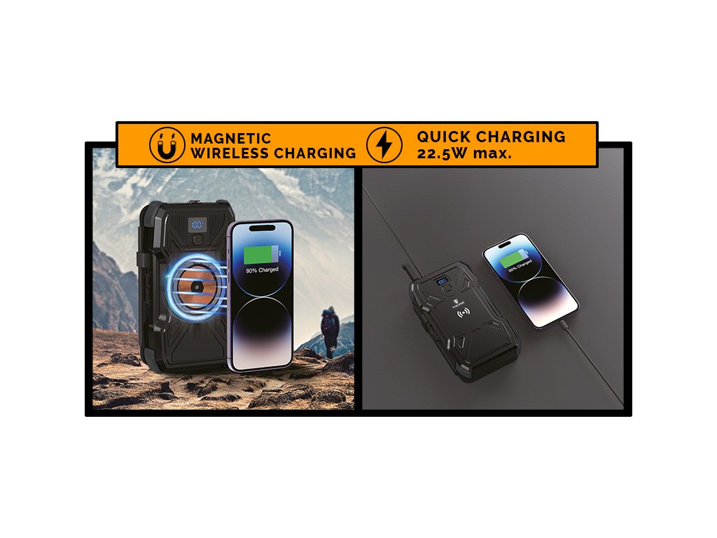 Ak vaše zariadenie podporuje bezdrôtové nabíjanie, môžete využiť túto funkciu na ešte väčšie pohodlie. Jednoducho priložte zariadenie k powerbanke a začnite nabíjať s výkonom až 15W. Vďaka magnetickému poľu je spustenie wireless nabíjania ešte jednoduchšie a zariadenie vám z powerbanky nesklzne mimo nabíjacej oblasti.