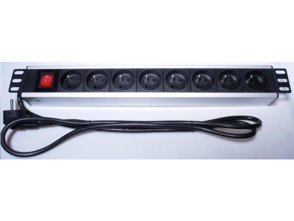Napájací panel do 19" racku, 8x230V, 2m kábel, vypínač - vyhotovenie z eloxovaného hliníka - horizontálne na montáž do 19" Racku - výška 1,5U - 8x 230V zásuvka - maximálny prúd: 16A - UTE zásuvky - 1.5mm2 priečny rez kábla - dĺžka kábla 2m - vypínač presvietený s plastovou krytkou proti náhodnému vypnutiu - rozmery: šírka s pevnými úchytmi: 485mm, výška: 61mm, hĺbka: 44mm - pracovná teplota: 0-40°C - napájací panel obsahuje sáčik s kompletnou sadou skrutiek na montáž do 19' racku