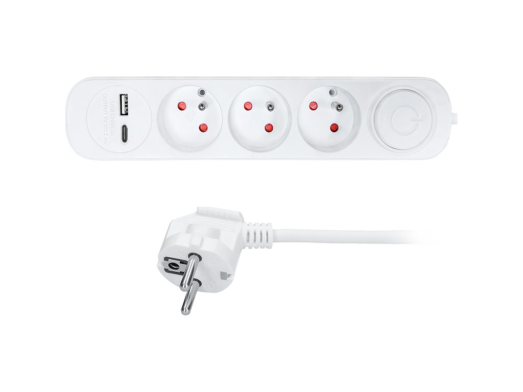 Solight 3z prodlužovací přívod s USB A+C nabíječkou 2.4A, 2m, 3 x 1mm2, bílý, vypínač