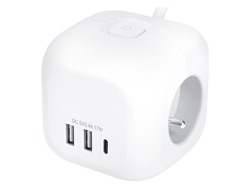 Predlžovací prívod v tvare kocky s dĺžkou strany 8 cm spája tri uzemnené zásuvky s detskou poistkou a USB nabíjačku s portami USB-C a USB-A. Vďaka 2m dlhému káblu poskytuje flexibilné využitie. Protisklzové podložky udržiavajú prívod stabilný na stole alebo pracovnej ploche. Podsvietený vypínač umožňuje jednoduché ovládanie všetkých zásuviek aj USB portov.