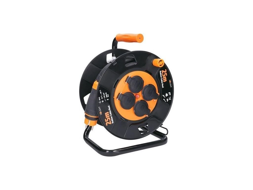 25m gumový kábel na bubne z odolného plastu a štyrmi zásuvkami je ideálny na použitie vonku, na záhradách, stavbách alebo v dielňach. Pevná konštrukcia s krytými zásuvkami aj samotný kábel sú odolné voči poveternostným podmienkam a mechanickému namáhaniu.