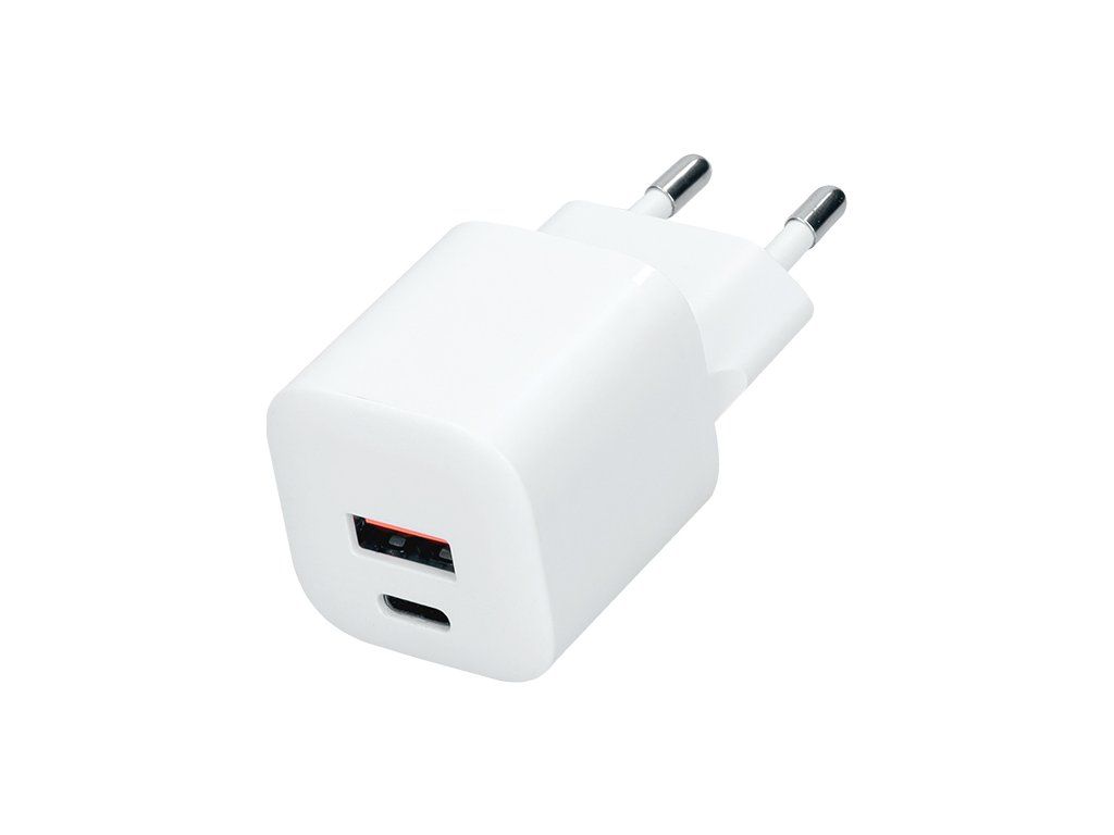 USB-C a USB-A 20W PD GaN rýchlonabíjačka s dvomi výstupmi pre efektívne nabíjanie. Vstup: AC 110-240V, 0,5A, 50-60Hz. Výstupy: USB-C 5V3A, 9V2.2A, 12V1.67A; USB-A 5V3A, 9V2A, 12V1.5A; USB-A+C 5V3A. Farba: biela. Kompaktná nabíjačka ideálna pre rýchle a bezpečné nabíjanie viacerých zariadení súčasne.