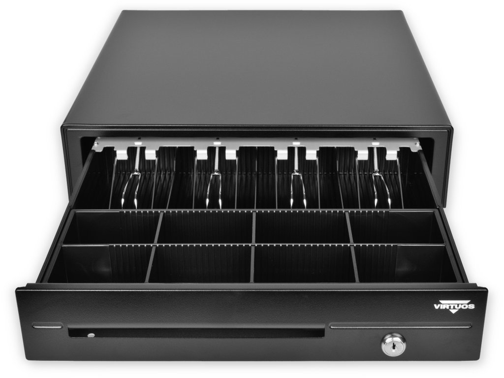 Komentár k produktu Pokladničná zásuvka Virtuos C420D - s káblom, kovové držiaky, 9-24V, čierna