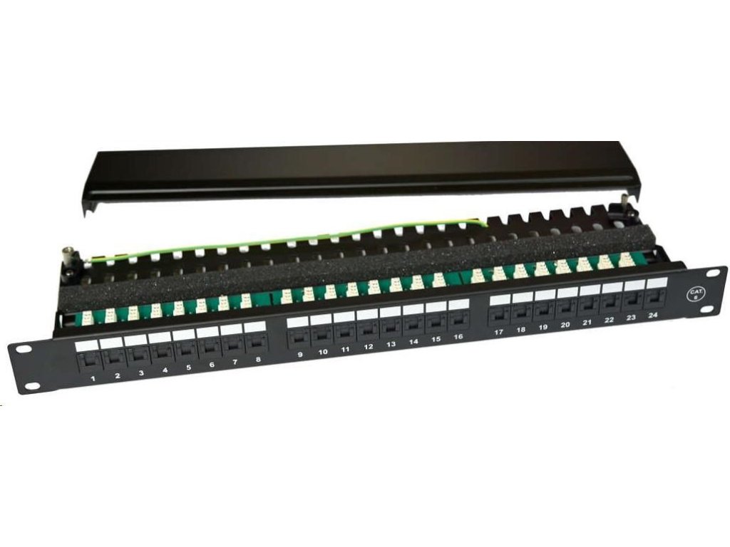 19" Patch panel 24port, UTP, Cat6, černý s krytkami RJ45