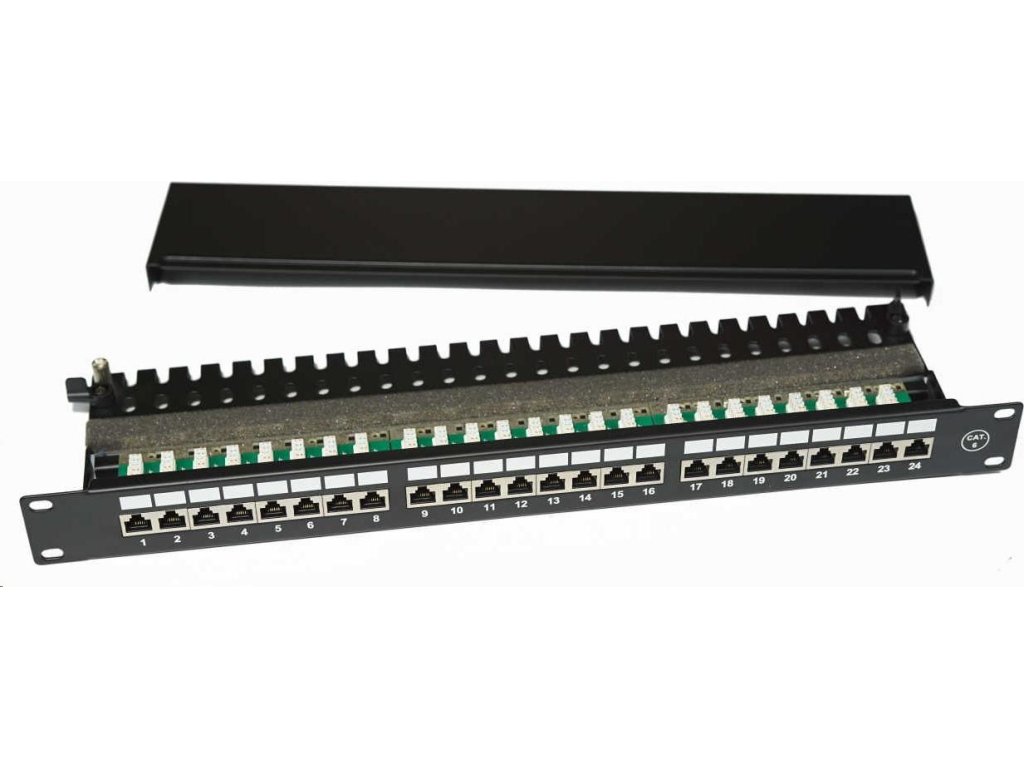19" Patch panel EXCLUSIVE s 24 portmi, FTP (SFTP, STP), Cat 6, s hrotom
