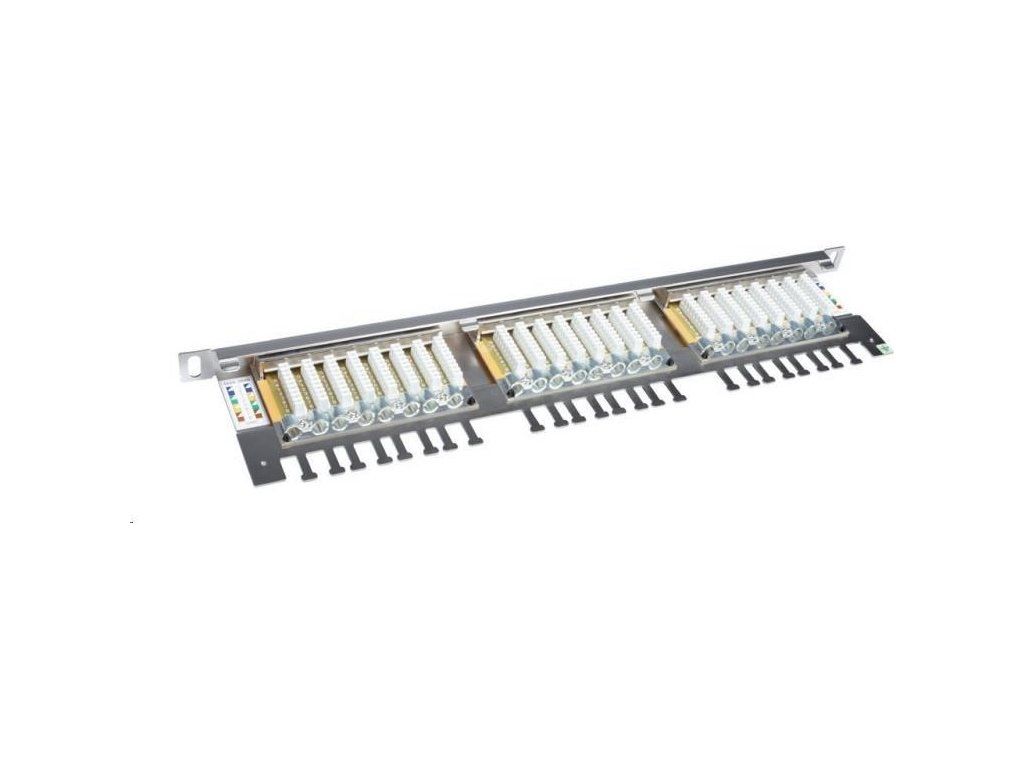 Vysokohustotný 0,5U tienený patch panel CAT6 s 24 portmi a viazacou lištou.