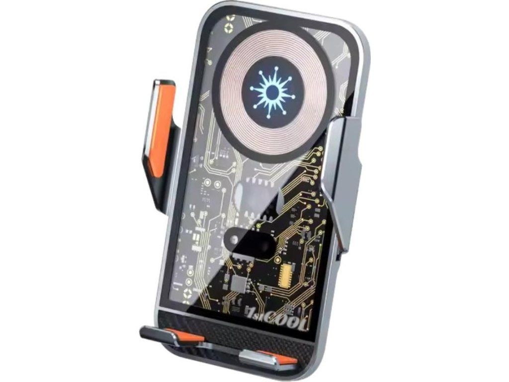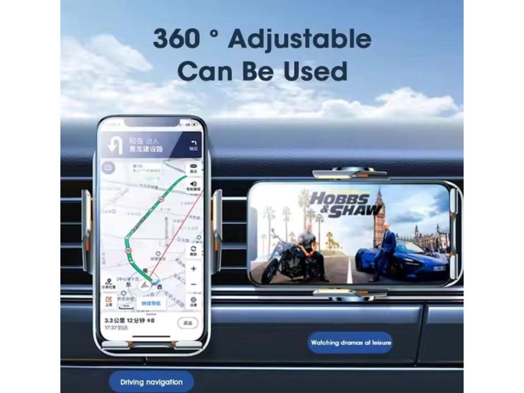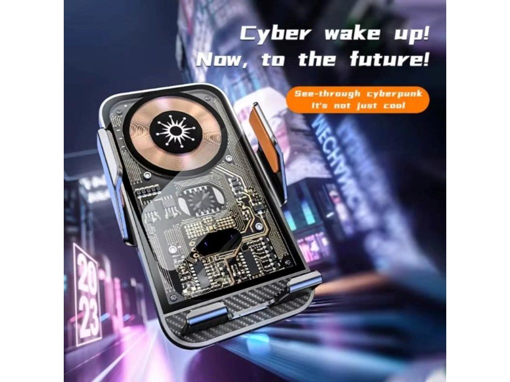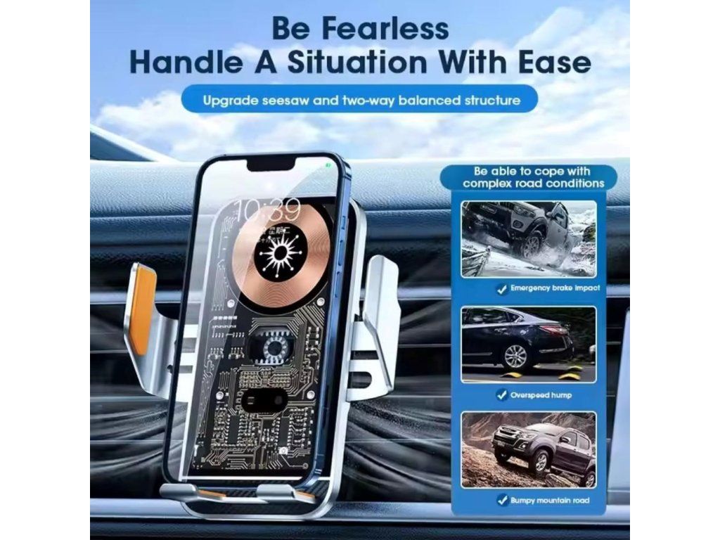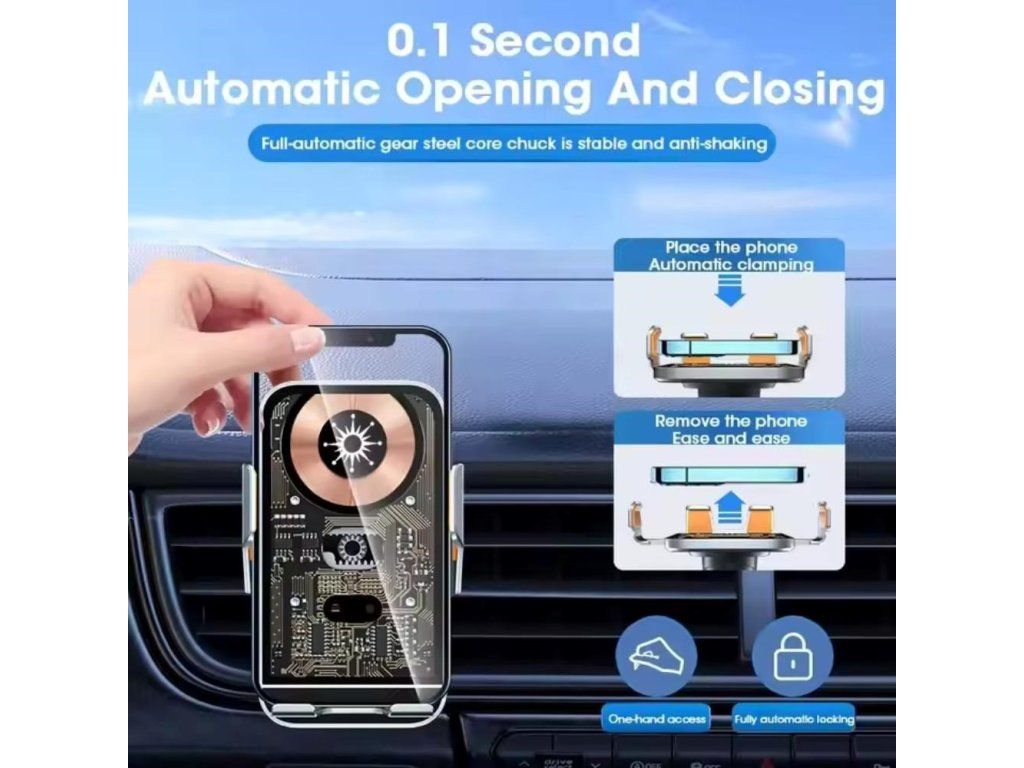 C10 Kvalitná hliníková bezdrôtová inteligentná nabíjačka do auta s optickým senzorom pre automatické roztiahnutie pri vkladaní telefónu a dotykovým senzorom pre otvorenie držiaka pri vybratí. Vybavená je držiakom s kĺbovou aretáciou na uchytenie do ventilácie.