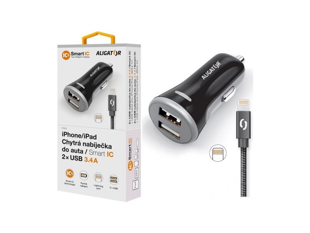 Chytrá nabíječka do auta ALIGATOR 3.4A, 2xUSB, smart IC, černá, USB kabel pro iPhone/iPad