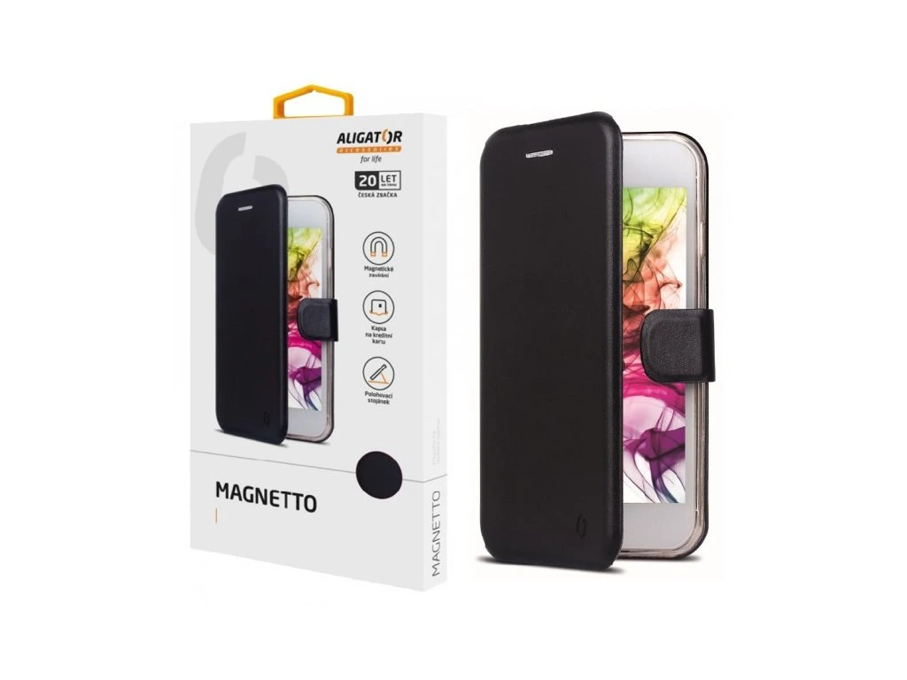 Dokonale propracovaný design, ultratenké provedení, přihrádka na kartu nebo vizitky, zavírání pomocí magnetické přezky, snadné uchycení mobilního telefonu pomocí silikonové vaničky, stojánek… To je ALIGATOR MAGNETTO.