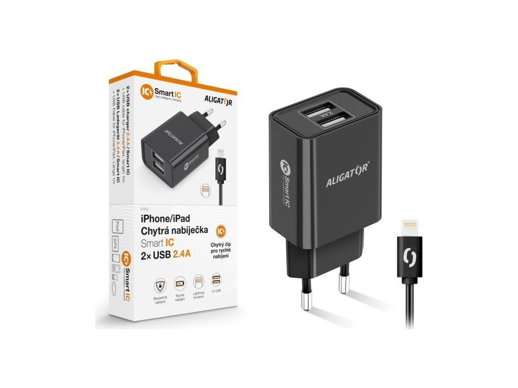 Aligator síťová nabíječka, 2x USB, smart IC, 2,4 A, kabel Lightning 2A, černá