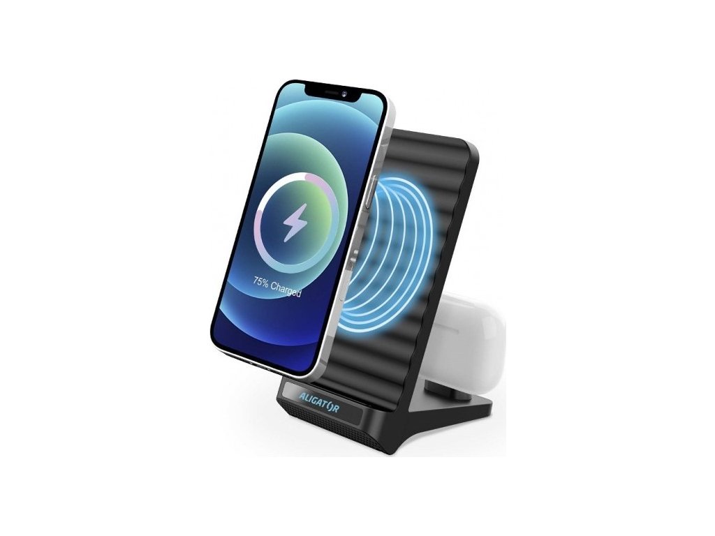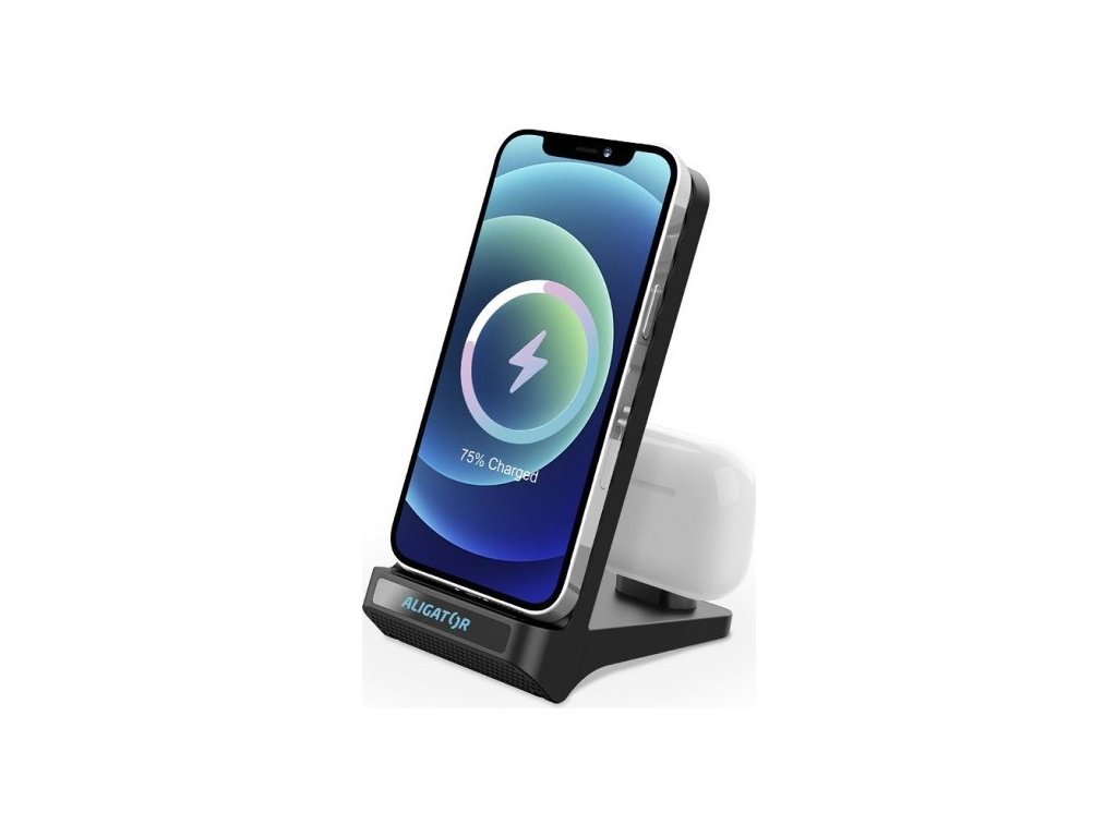 Stojánek s bezdrátovým nabíjením Aligator 2v1. Rychlé bezdrátové nabíjení chytrého telefonu o výkonu 15W a USB-C konektor pro nabíjení True Wireless sluchátek a drobného příslušenství.