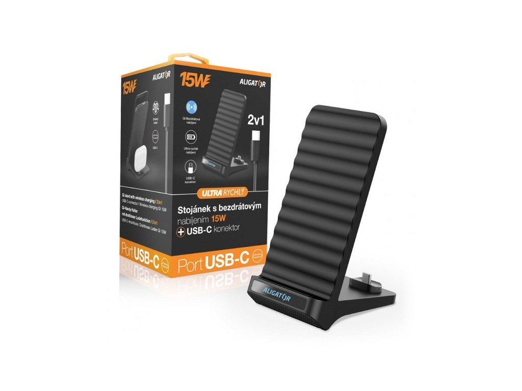 Aligator Stojánek s bezdrátovým nabíjením 15W a USB-C konektorem, 2v1, černý