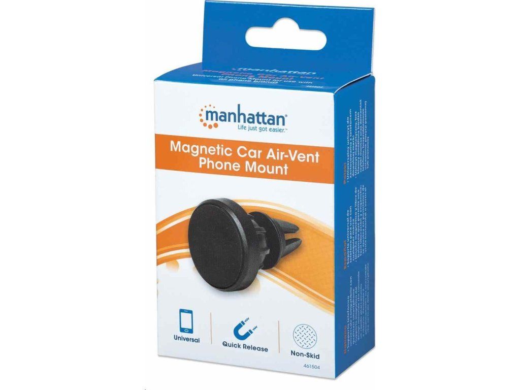 Magnetický držiak telefónu do auta Manhattan Air-Vent možno použiť so všetkými telefónmi a inými zariadeniami na pohodlné a bezpečné upevnenie zariadenia na cestách. Držiak telefónu ponúka dve rôzne veľkosti klipov, takže ho môžete ľahko nainštalovať priamo do vetracieho otvoru väčšiny vozidiel. Priložené magnetické podložky umožňujú pripevnenie zariadenia na výšku aj na šírku. Nastaviteľný, uzamykateľný guľový kĺb ponúka možnosť otáčania o 360°, takže si môžete základňu nakloniť, ako uznáte za vhodné, a vďaka zabudovanej protišmykovej podložke zostane vaše zariadenie v bezpečí pred vibráciami na ceste a nečakanými nárazmi.