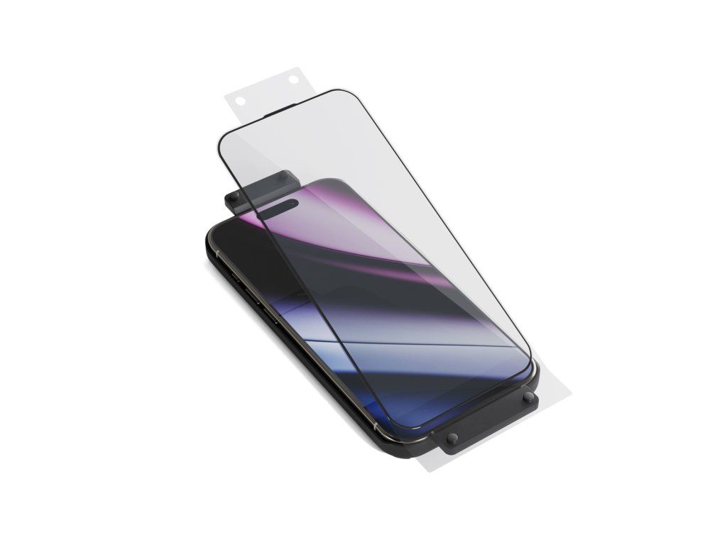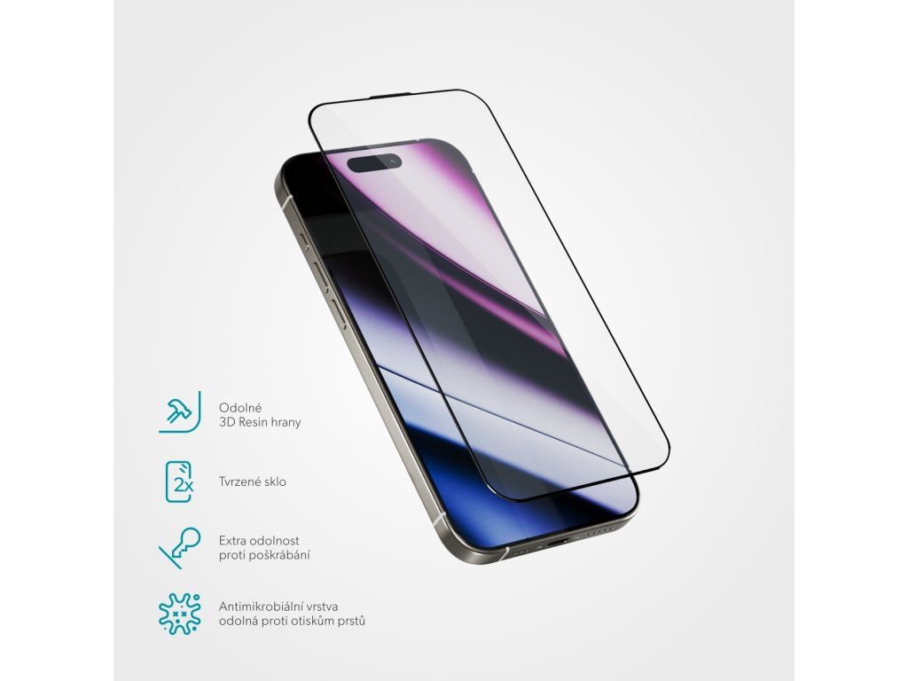 3D ochranné sklo, pro Apple iPhone 16, tvrdost 9H, tloušťka 0,33 mm, antimikrobiální povrch, součástí balení: instalační rámeček.