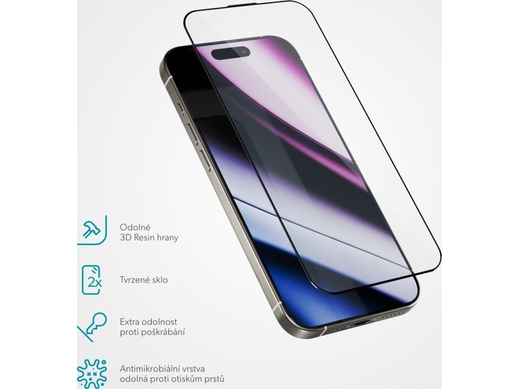 3D ochranné sklo, pro Apple iPhone 16 Pro, tvrdost 9H, tloušťka 0,33 mm, antimikrobiální povrch, součástí balení: instalační rámeče.