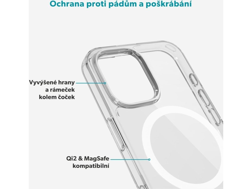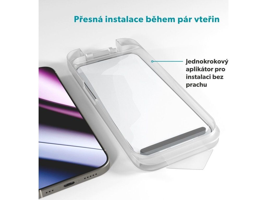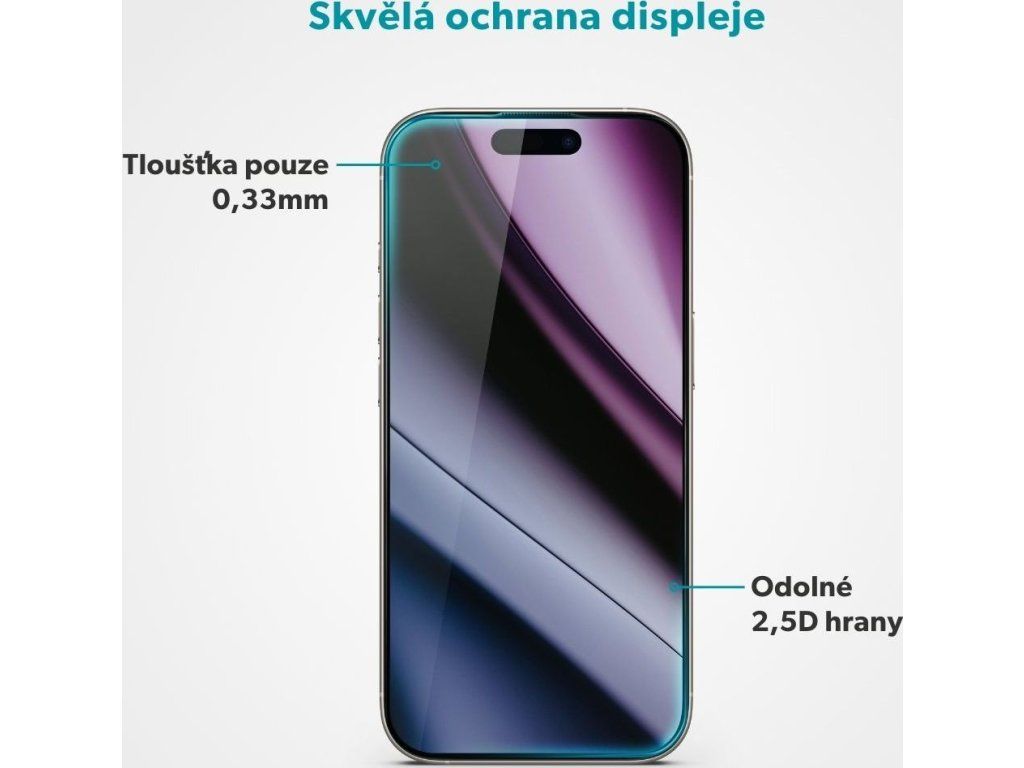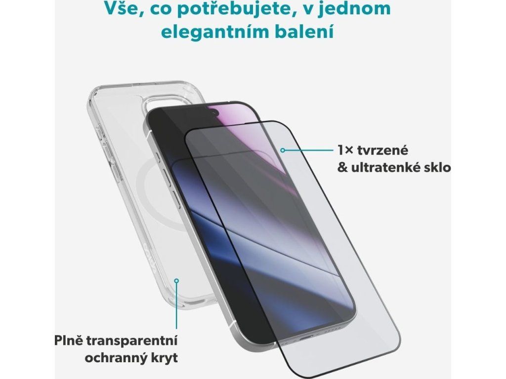 Průhledná zadní strana krytu s UV ochranou zabraňuje zežloutnutí a zachovává původní vzhled iPhonu. Ochranné sklo kryje displej od kraje ke kraji a s tloušťkou 0,33 mm v kombinaci s tvrdostí 9H ho spolehlivě chrání, aniž by snižovalo citlivost dotyku nebo ostrost obrazu. Speciální vrstva proti otiskům prstů zároveň udržuje povrch displeje čistý a bez šmouh. Štíhlé provedení krytu a hladké 2,5D hrany skla zaručují, že váš iPhone působí elegantně a příjemně padne do ruky. Pružný rámeček krytu a jednokrokový aplikátor skla usnadňují instalaci, takže vše zvládnete rychle a snadno.