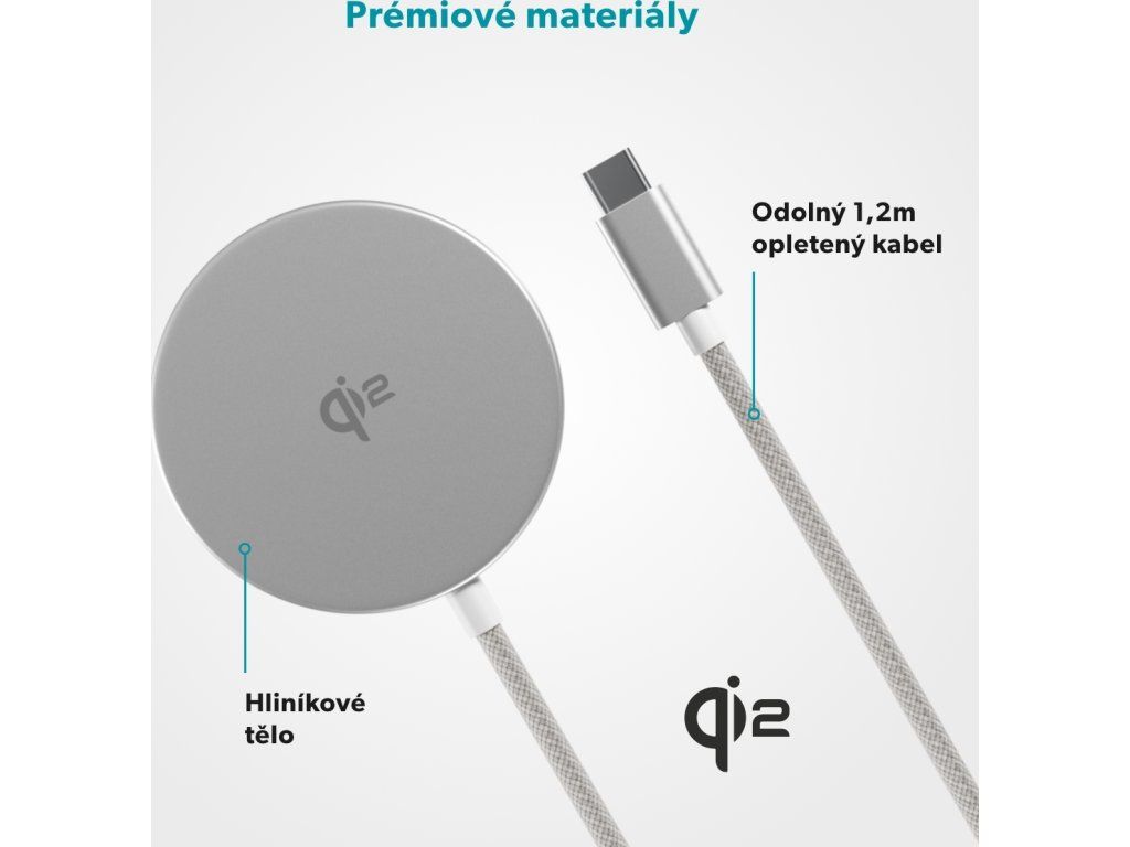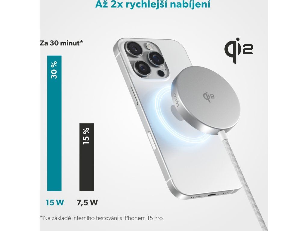 Bezdrátová nabíječka, certifikace Qi2, podpora MagSafe, výkon 15W, integrovaný 1,2m kabel USB-C. Rychlé a bezpečné nabíjení s Qi2 Certifikace Qi2 & kompatibilita s MagSafe