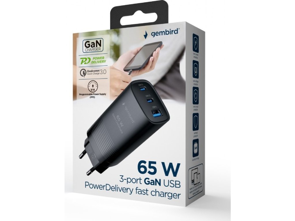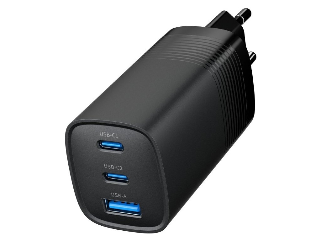 3-portová rýchlonabíjačka USB s výkonom 67 W: podporuje špecifikácie QC 3.0 aj PowerDelivery (PD) Technológia GaN: kompaktný dizajn a zvýšená energetická účinnosť Porty typu C podporujú 67 W PD, port typu A podporuje 27 W QC 3.0 Inteligentná ochrana proti nadprúdu, prepätiu, skratu a prehriatiu Vstupné napätie: 100 V – 240 V ~, až 1,5 A Spotreba energie v pohotovostnom režime: < 0,1 W Priemerná účinnosť: > 87,6 % Účinnosť pri 25 % zaťažení: > 84 % Účinnosť pri 100 % zaťažení: > 88,26 % Výstup C1/C2: 5,0 V/3,0 A, 9,0 V/3,0 A, 12,0 V/3,0 A, 15,0 V/3,0 A, 20,0 V/3,35 A (max. 67,0 W) Výstup A1: 3,4 V – 5,5 V/5,0 A, 5,0 V/3,0 A, 9,0 V/3,0 A, 12,0 V/3,0 A, 20,0 V/3,0 A (max. 60,0 W) Výstup C1 + C2: 45,0 W + 20,0 W (max. 65,0 W) C1 + A1: 45,0 W + 18,0 W (max. 63,0 W) C2 + A1: 5,0 V / 4,8 A (max. 24,0 W) C1 + [C2 + A1]: 45,0 W + 15,0 W (max. 60,0 W) Ochrana výstupu: skrat, prepätie, prebitie, prehriatie Rozmery: 39 mm x 106 mm x 34 mm Čistá hmotnosť: 124 g