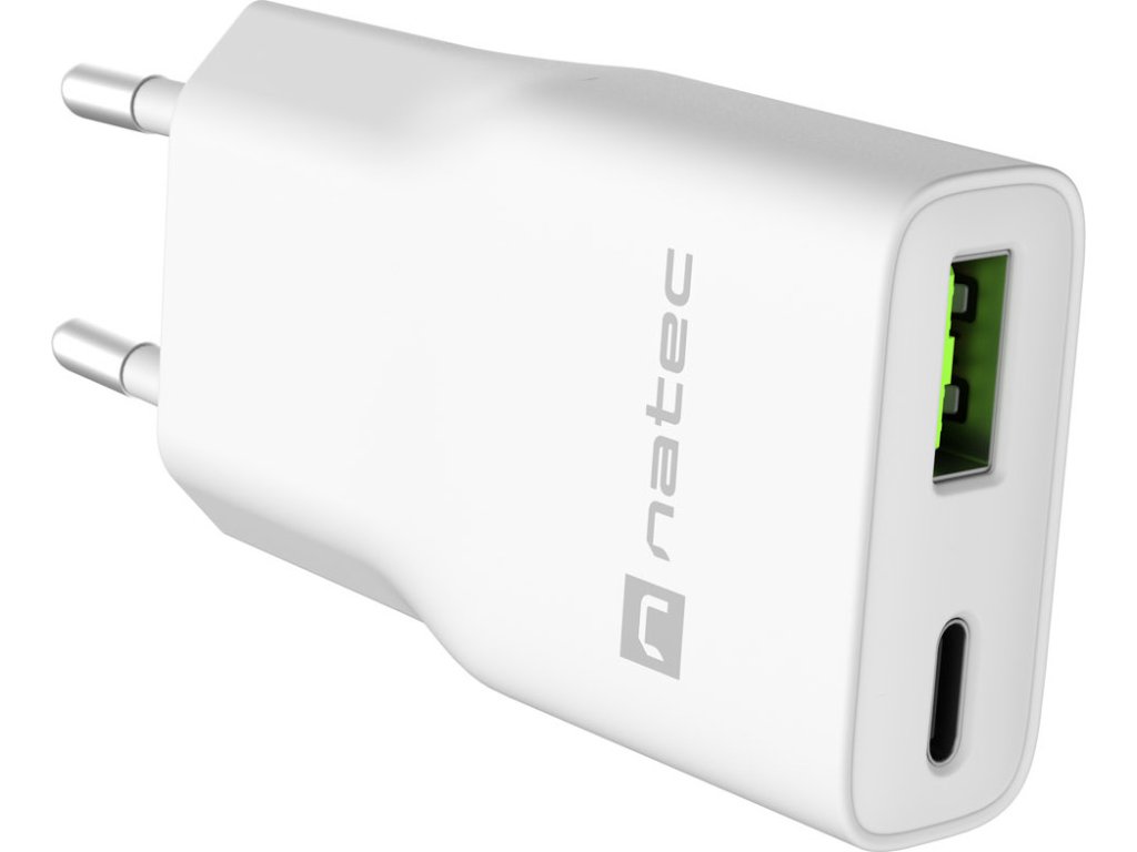Univerzální USB nabíječka Natec RIBERA GaN SLIM, 20 W, 1X USB-A + 1X USB-C, Bílá