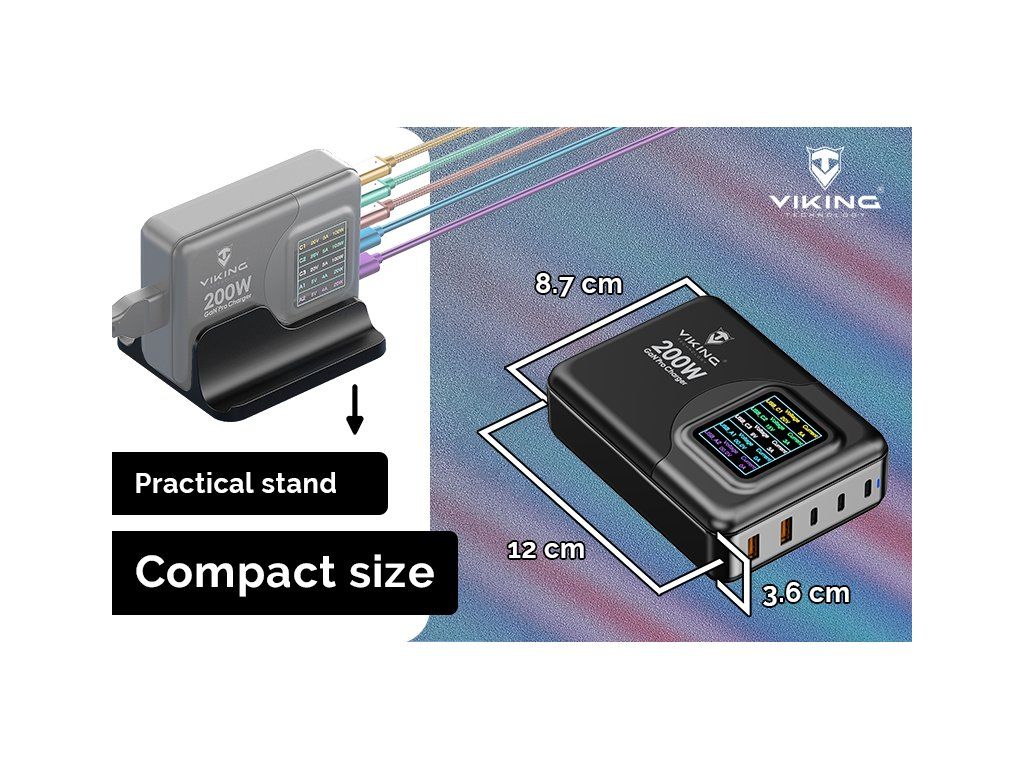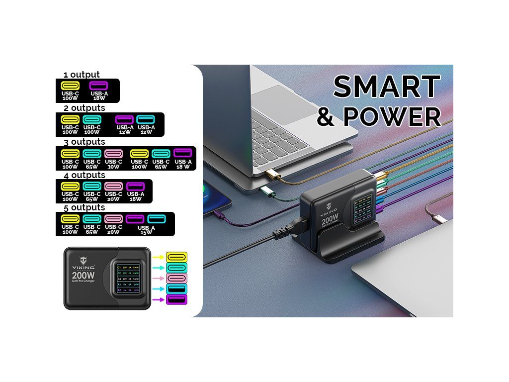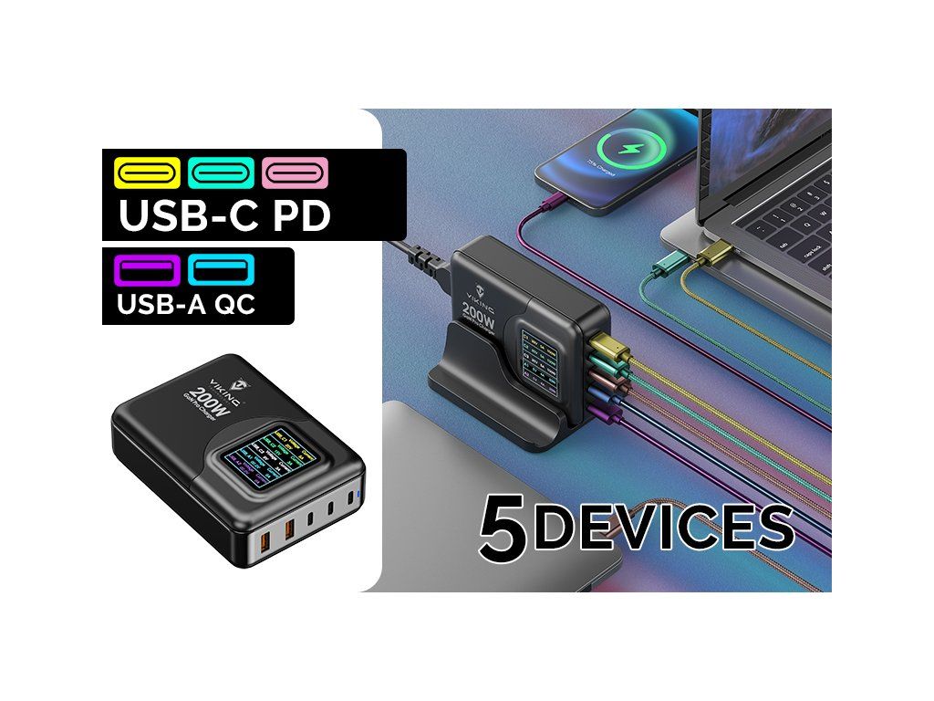 So tromi výstupmi USB-C PD (100W max.) a dvomi USB-A QC (18W max.) je táto nabíjačka pripravená dodať energiu piatim zariadeniam súčasne, a to s maximálnym výkonom až 200W. So Viking USB GaN nabíjačkou 200W PD Pro si môžete byť istí, že vaše elektronické zariadenia budú nabité a pripravené na akciu v rekordnom čase. Inteligentná technológia adaptéra Viking Gan 200W PD Pro dokáže rozdeliť nabíjací výkon podľa počtu využitých výstupov, tak aby bolo nabíjanie jednoduché a efektívne pre všetky pripojené zariadenia. Rozdelenie energie a priebeh nabíjania môžete sledovať na prehľadnom farebnom displeji.