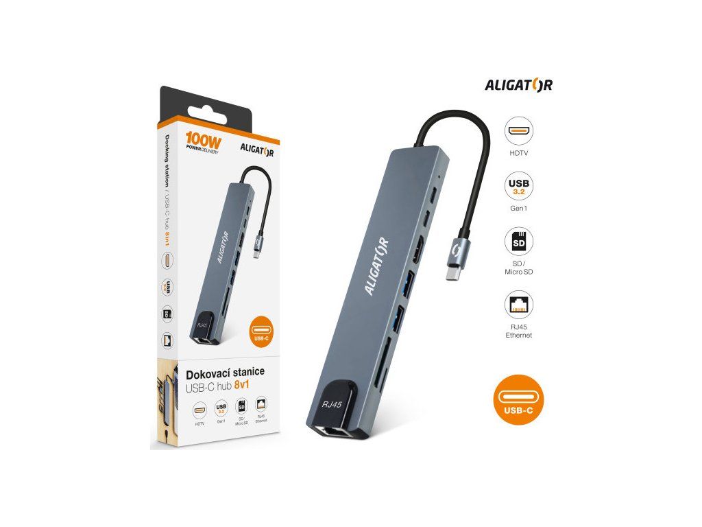 Aligator Dokovací stanice USB-C / Hub 8v1 (USB-C / 2xUSB / SD / MicroSD/ HDTV / RJ45)