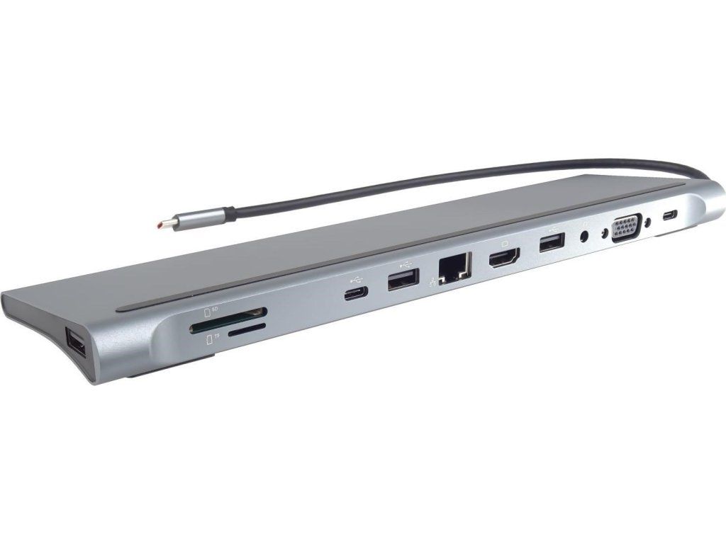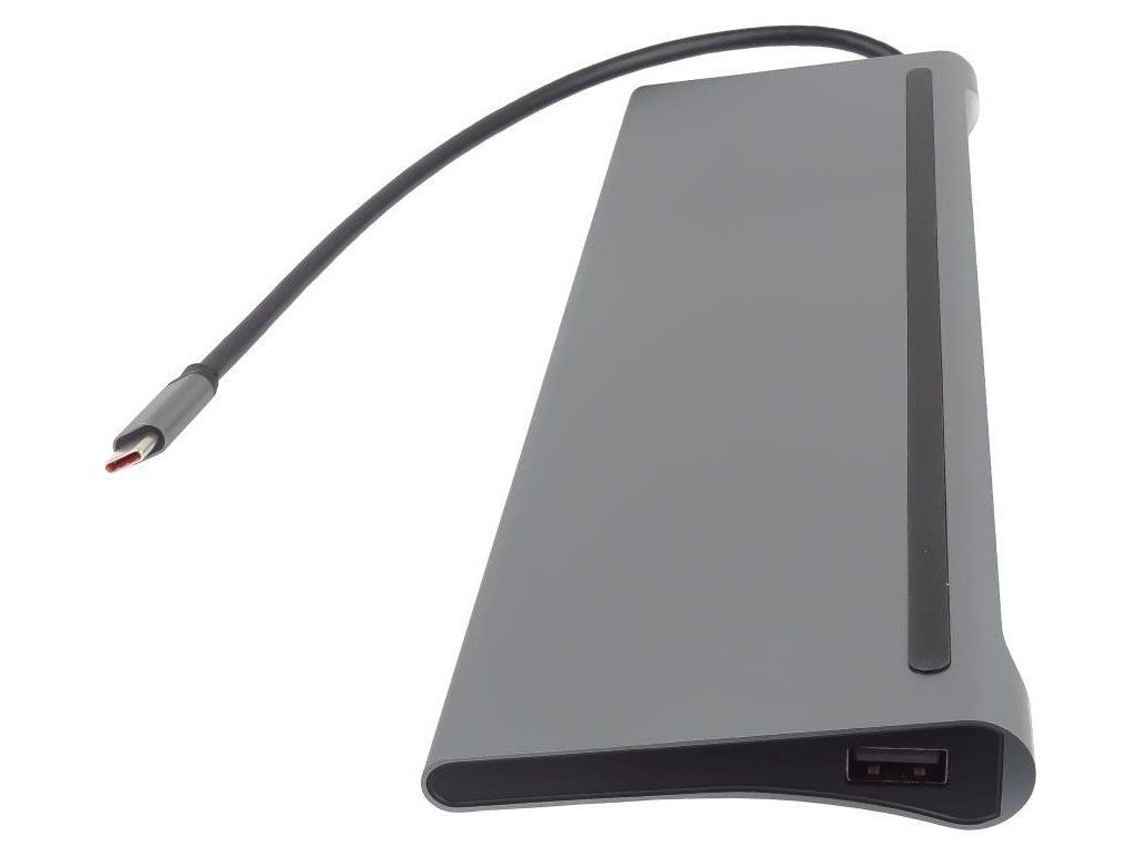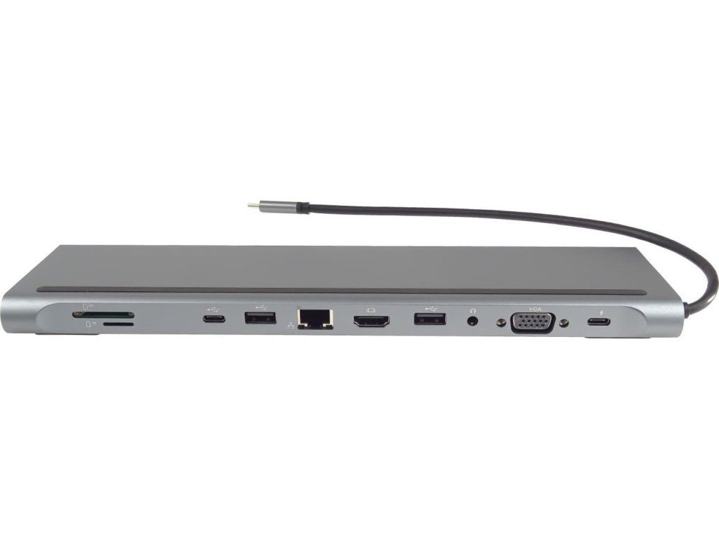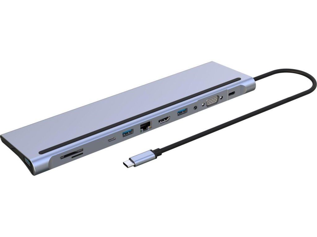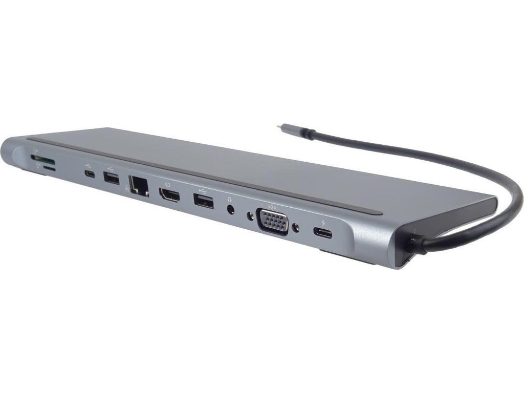 PREMIUMCORD Dokovací stanice USB-C 10v1, 1xHDMI, 1xVGA, 2xUSB-C, 3xUSB, 1xRJ45, čtečka SD karet, šedá