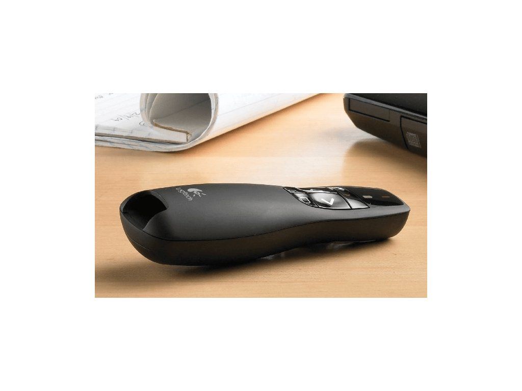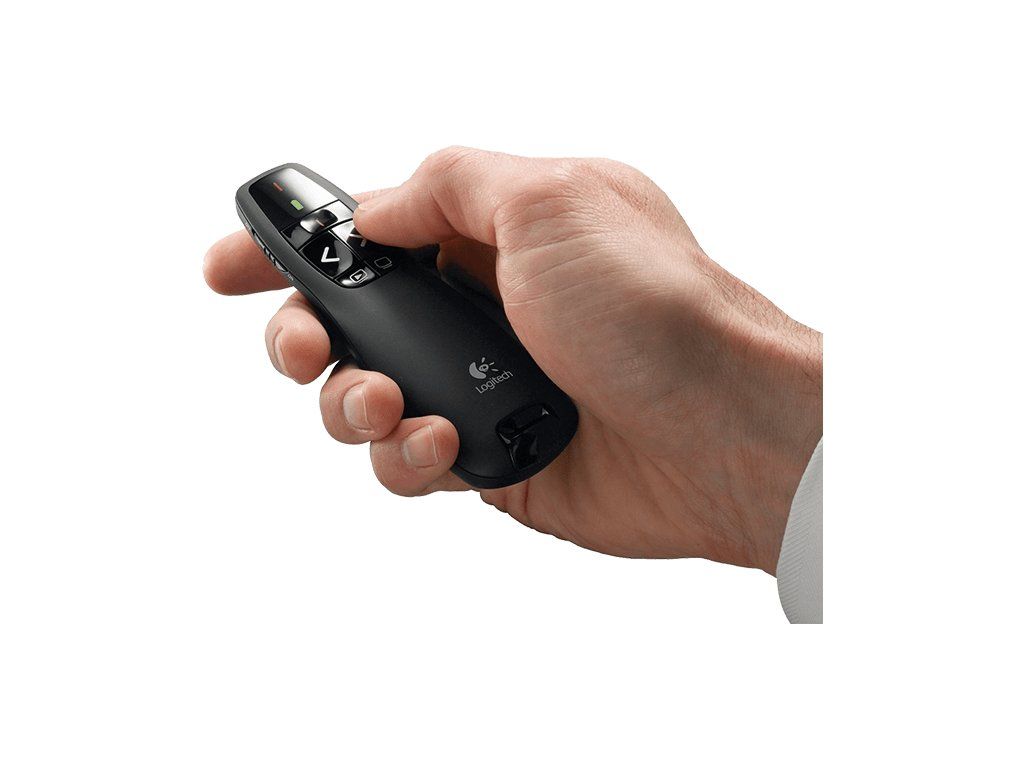 Prezentačné zariadenie Logitech Wireless Presenter R400 vám pomôže vyjadriť svoj názor. Intuitívne ovládacie prvky prezentácie vám umožňujú prechádzať prezentáciou s istotou. Tlačidlá sa ľahko nájdu po hmatu. Tvar skvele padne do ruky. Disponuje červeným laserovým ukazovátkom, ktoré je dobre vidieť na väčšine pozadí, a dosahom až 15 metrov, ktorý vám dáva možnosť voľne sa pohybovať po miestnosti a vmiešať sa do publika. Vďaka kompaktnému bezdrôtovému prijímaču s technológiou Plug and Play je inštalácia jednoduchá – nemusíte inštalovať žiadny softvér. Po skončení prezentácie možno prijímač uložiť do prezentačného zariadenia, čo uľahčuje balenie.