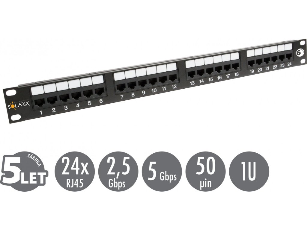 Patch panel Solarix s označením SX24-6-UTP-BK je vysoce kvalitní panel kategorie 6, který splňuje požadavky na komponenty této kategorie definované ve standardech ANSI/TIA 568, ISO/IEC 11801 a EN 50173 pro kategorii 6 a třídu vedení Class E, včetně všech nejnovějších dodatků. Tento panel je testován pro šířku pásma až do 350 MHz, čímž převyšuje požadavky specifikované pro kategorii 6. Panel je dodáván ve verzi s 24 porty RJ45 a je osazen moduly s duální IDC svorkovnicí 110/Krone. Kontakty jsou na svorkovnici z důvodu snadného zakončení datového kabelu označeny jednotlivými barvami podle typu zapojení a to buď podle standardu T568A nebo T568B. Panel SX24-6-UTP-BK patří do skupiny komponentů systému Solarix - kategorie 6 a stejně jako všechny komponenty v této produktové řadě je vyroben tak, aby poskytoval maximální životnost, vynikající výkon, spolehlivost a především jednoduchou instalaci. Barva Solarix patch panelu kategorie 6 je černá; velikost v datovém rozvaděči je 1U.