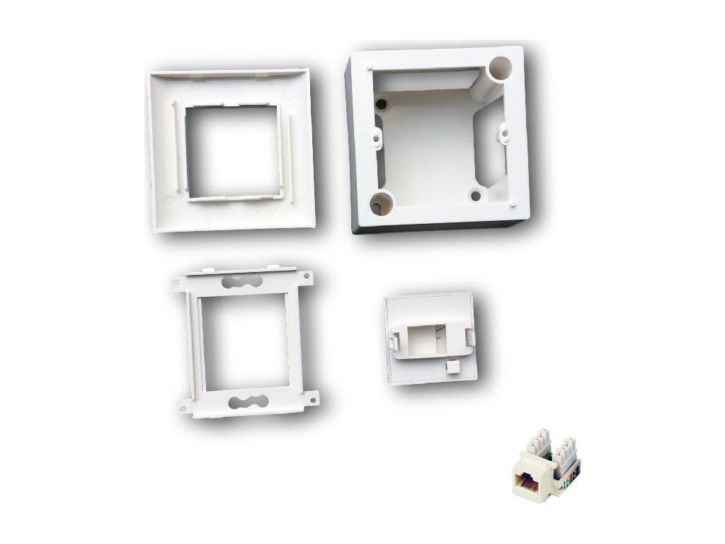 - 1 x /8p8c/ RJ45 UTP keystone je součástí balení, na obrázku schovaný za protiprachovou krytkou