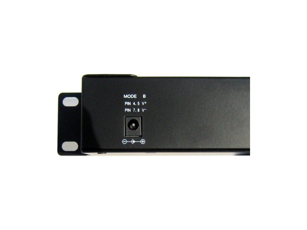Vstup pro napájení prostřednictvím jednoho ze dvou 2.1mm 60V jacků, z obou vstupů je vždy zároveň napájeno všech 16 portů v POE režimu dle zvoleného A/B vstupu: