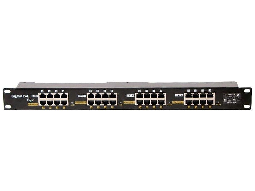 Panel do 19" racku integrující 16 gigabitových stíněných pasivních POE injektorů s napájecím rozsahem 24 - 57V.