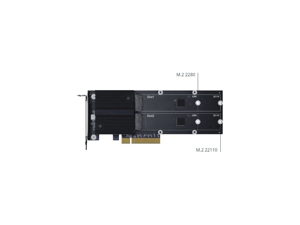 Zvýšenie výkonu úložiska pre náročné pracovné zaťaženie Synology M2D20 je karta adaptéra M.2 NVMe SSD navrhnuté na zvýšenie I/O výkonu zariadení NAS. Schopnosť pracovať s viacerými frontami NVMe SSD výrazne pomáha pri aplikáciách citlivých na oneskorenie, ako je indexovanie fotografií, vyhľadávanie súborov a nasadenie virtualizácie. Stránky produktu: https://www.synológia.com/en-US/products/M2D20 Technické špecifikácie: