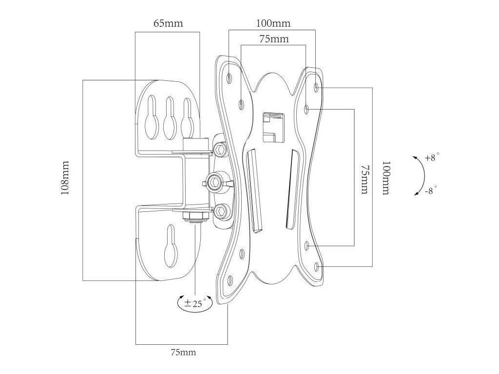 Držiak monitora TV Ergosolid FN502 Kvalitný nástenný držiak na TV monitory 10-30", otočný +/- 25°, sklopný +/- 8°, podpora VESA 75x75 a 100x100, vzdialenosť od steny 75mm, nosnosť 25kg Kvalitné riešenie, ako zaviesť menšiu televíziu alebo monitor s uhlopriečkou 10-30" na stenu a mať možnosť natáčania do strán a nakláňania. Nástenný držiak FN502 Vám umožní kedykoľvek televíziu otočiť do strany až o 25° a nakloniť až o 8°. Podporuje VESA štandardy 75x75 a 100x100, vzdialenosť TV od steny je 75mm a zaviesť môžete obrazovky s hmotnosťou až 25kg. Vynikajúca kvalita konštrukcie zabezpečí úplne bezpečné a spoľahlivé zavešenie. Jednoduchá montáž, montážny materiál a záruka 10 rokov. Otočný a sklopný držiak TV monitoru Ergosolid FN502 Technické údaje: nosnosť 25kg podpora VESA štandardu 75x75 a 100x100 na monitory a televízory 10" až 30" (podľa VESA aj väčšie) otáčanie do strán +/- 25° náklon +/- 8° vzdialenosť od steny 75mm veľmi pevná a bezpečná konštrukcia materiál oceľ farebné prevedenie čierne balenie obsahuje inštalačný materiál záruka 10 rokov Otočný a sklopný držiak na TV monitor bez ramena, vzdialenosť 75mm, nosnosť 25kg - Ergosolid FN502 Držiak Ergosolid FN502 podporuje VESA štandardy: VESA 75x75 VESA 100x100 Na držiak Ergosolid FN502 je možné zaviesť všetky typy, značky a veľkosti TV a monitorov, ktorých hmotnosť je do 25kg a ktoré podporujú VESA štandard 75x75 alebo 100x100. Uhlopriečka nie je podstatná - uvádzané uhlopriečky v popise sú iba orientačné. VESA štandard je celosvetovo uznávané označenie pre štandard montáže televízorov, monitorov a obrazoviek. Označuje rozteč 4 montážnych otvorov na zadnej strane zariadenia pre uchytenie na držiak.