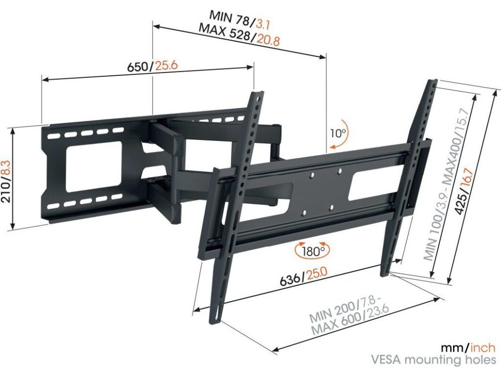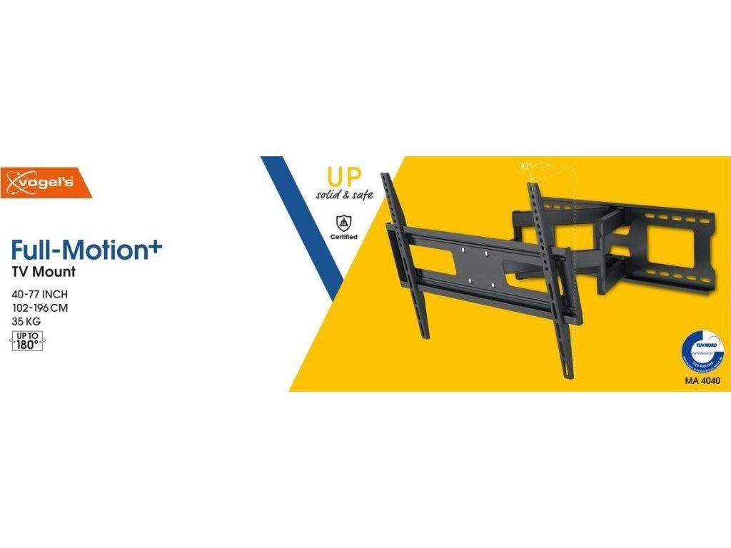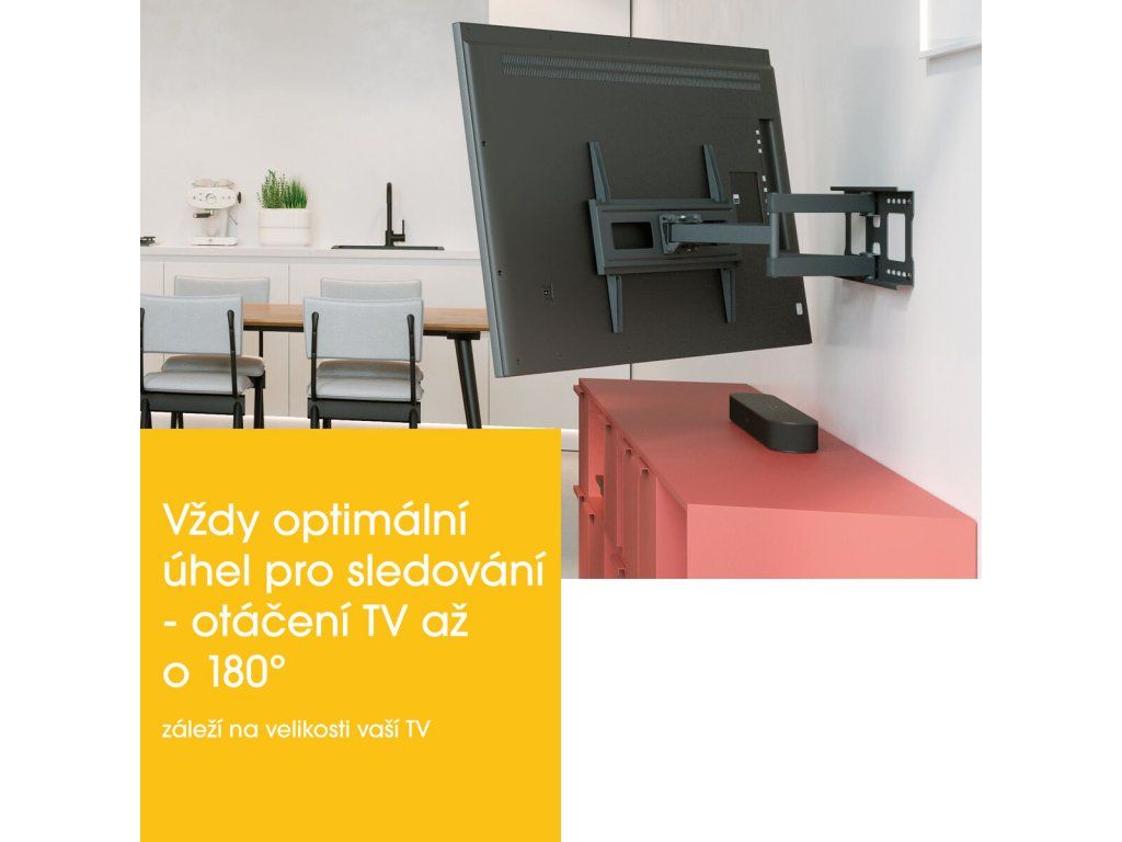 Spolehlivý držák s dvojitým ramenem a 4 klouby. Tento robustní nástěnný držák je vhodný pro televizory s úhlopříčkou od 40 do 77 palců. Snadno si poradí s televizory o hmotnosti až 35 kg. Umožňuje natáčení TV až o 180° a náklon dolů o 10°.
