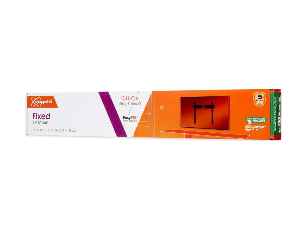 Nástěnné držáky televizorů QUICK se velmi snadno a rychle instalují díky jedinečnému systému EasyFIX™. Televizor můžete na stěnu připevnit ve třech jednoduchých krocích a užívat si jej již během maximálně 20 minut. Součástí balení je vrtací šablona, šrouby a hmoždinky Fischer® DuoPower. Všechny kroky instalace jsou jasně a stručně vysvětleny v přiloženém rychlém návodu k instalaci. Podrobný návod k použití si můžete prohlédnout také online nebo se podívat na instalační video. S bezplatnou aplikací DrillRight™ AR si snadno vyznačíte první vrtací otvor na stěně. Pak stačí jen přiložit vrtací šablonu. Praktické také je, že váš nástěnný držák televizoru QUICK Fixed má zabudovanou vodováhu. Montáž televizoru do perfektní roviny je proto velmi snadná.