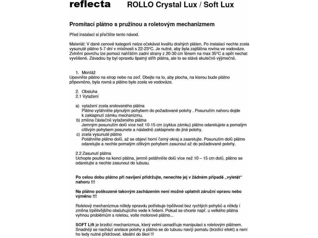 Roletové plátno ROLLO CrystalLine 160x160cm, viditeľná plocha 156x156cm, 1:1, 87"/221cm, biely hranatý kovový tubus 7x175cm/6kg, uchytenie na stenu alebo strop, materiál BetaLux - biela 0,35 tkanina 300g/m2 s 2cm čiernym okrajom a zadnou stranou, Gain=1,0, pozorovací uhol 120°. Lux - biely matný povrch pre maximálne verný a kontrastný obraz pri aspoň čiastočnom zatienení. PVC materiál s textilným základom vytvára rovný povrch bez vlnenia, ale na krajoch môže dochádzať k ohnutiu - postupne mizne. Jednoduché upevnenie 4 skrutkami na plastových bokoch plátna - stena alebo strop. Možnosť aretácie polohy plátna pri každom otočení mechanizmu. Pozor pri spätnom navíjaní plátna je nutné plátno podržať - nesmie dôjsť k rýchlemu navíleniu, ktoré pri náraze na tubus môže poškodiť vnútorný mechanizmus bez možnosti uplatnenia záruky.