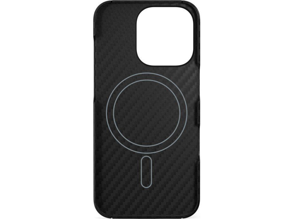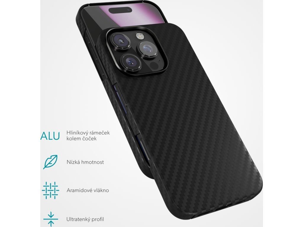 Kryt na telefon, pro Apple iPhone 16 Pro, kompatibilní s MagSafe, materiál aramidové vlákno, hliníkový rámeček kolem objektivů, barva černá.