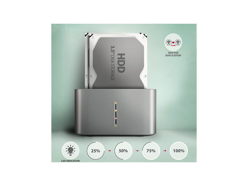 Dokovaciu stanicu môžete použiť aj na jednoduché klonovanie obsahu pripojených diskov bez nutnosti pripojenia k počítaču. Vložte zdrojovú jednotku do prvého slotu HDD A (zdrojový) a cieľovú jednotku do druhého slotu HDD B (cieľový). Potom už len stlačíte tlačidlo klonovania a sledujete proces klonovania na stupnici štyroch LED diód. Po skopírovaní všetkých údajov je na cieľovom disku presná kópia pôvodného disku. Dock je možné použiť ako samostatné zariadenie na pohodlné duplikovanie a vytváranie obrazov diskov. Toto je najjednoduchší spôsob, ako preniesť obsah starého HDD na nový SSD vrátane funkčného operačného systému (Windows, macOS, Linux...).